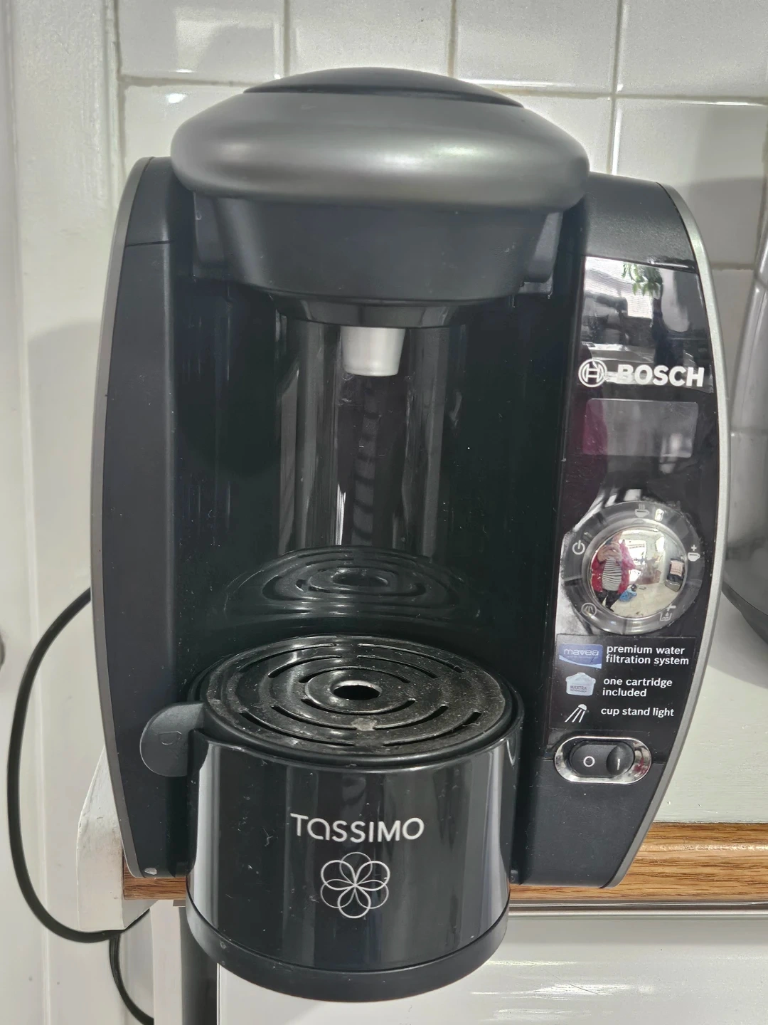 This is a black Bosch TASSIMO coffee machine. It features a premium water filtration system and includes one cartridge. It has a cup stand light.