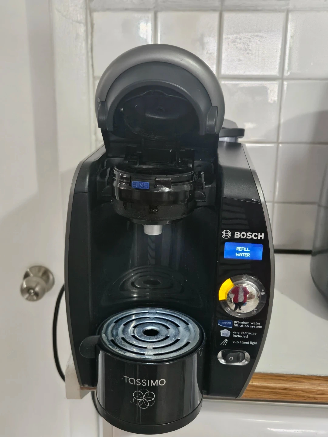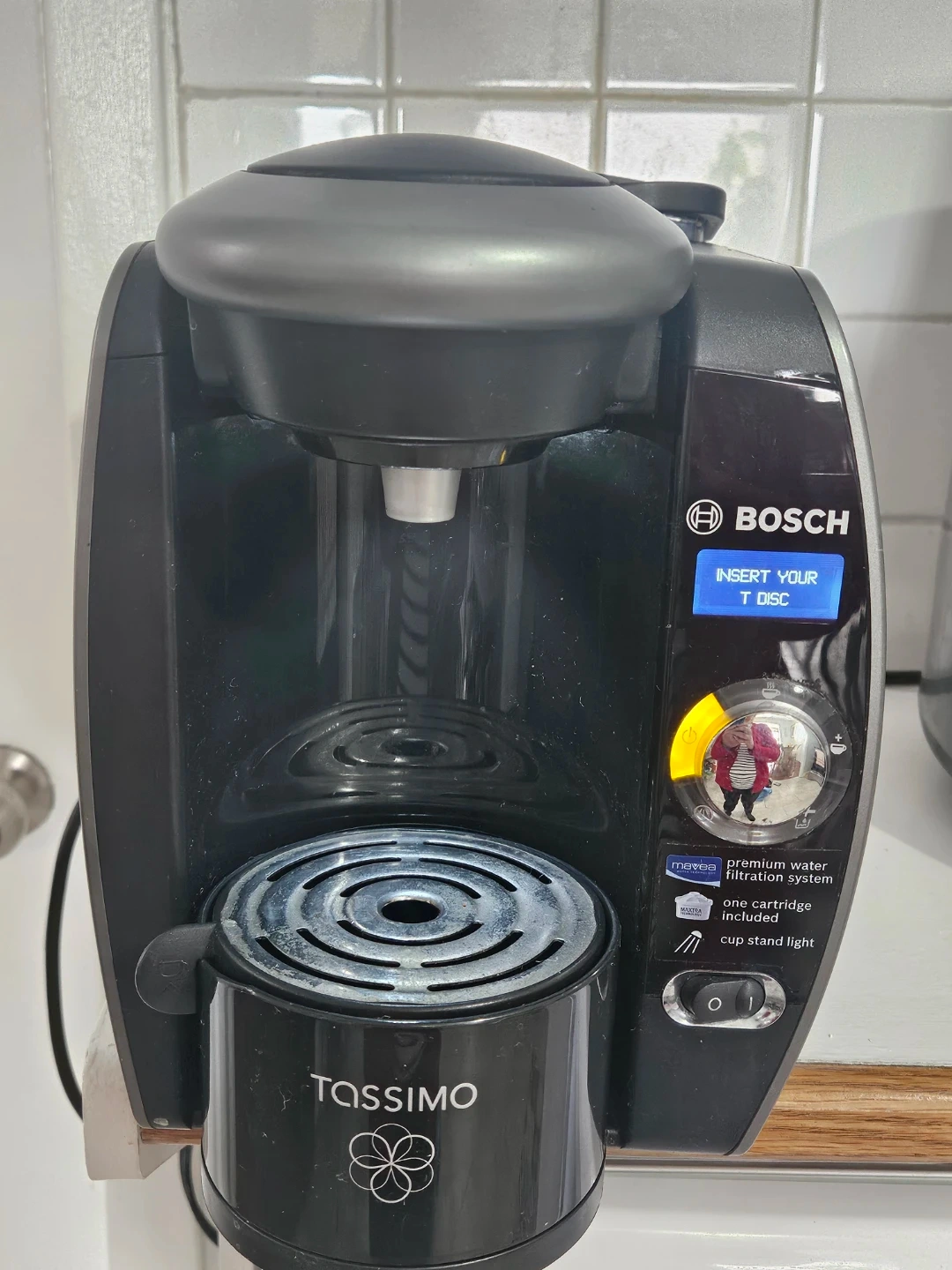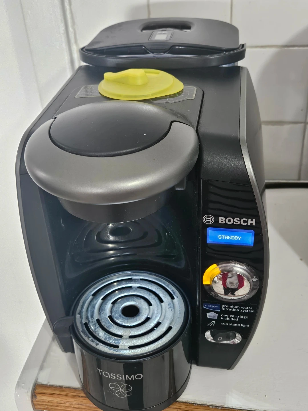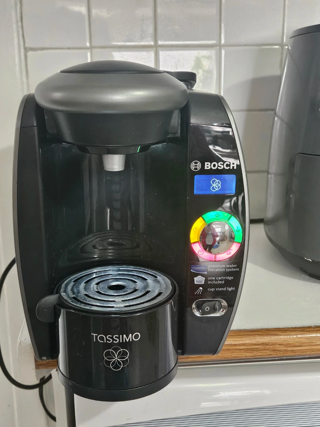 This is a black Bosch TASSIMO coffee machine. It features a premium water filtration system and includes one cartridge. It has a cup stand light.