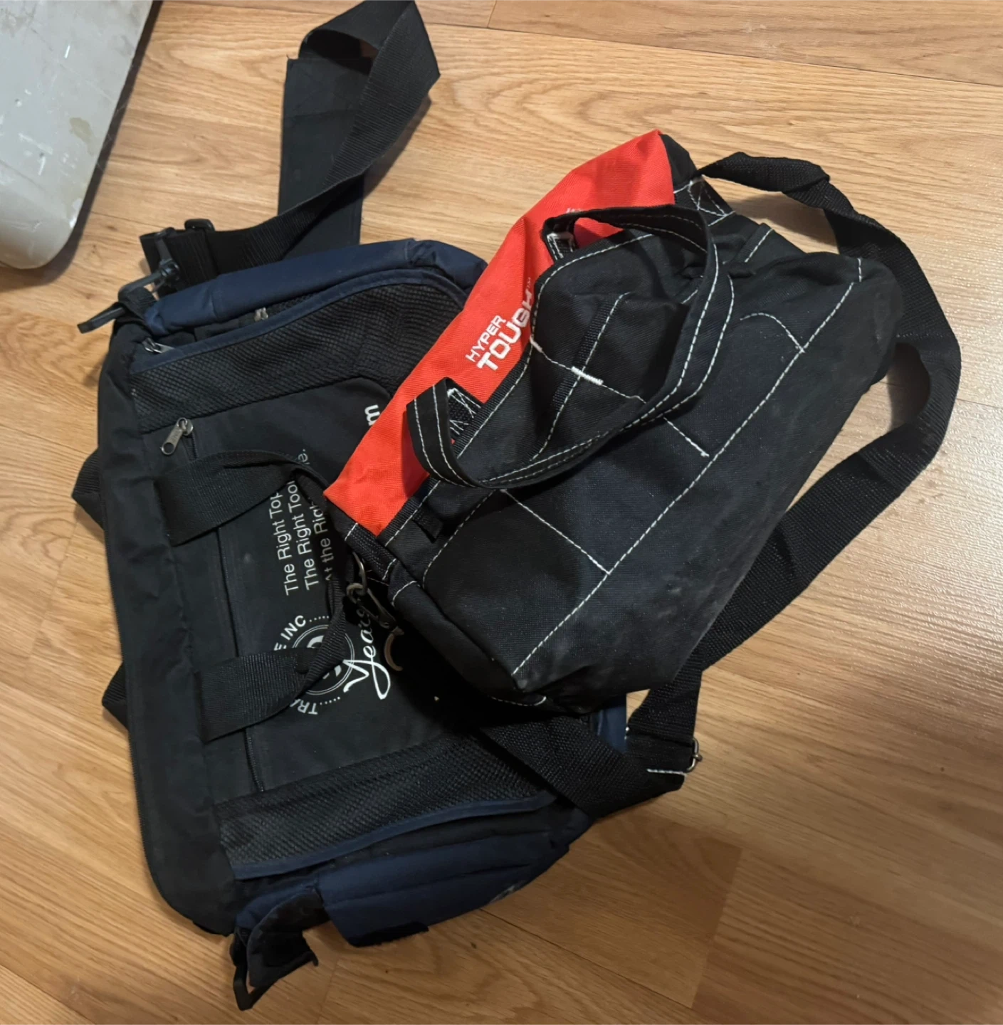 Two duffel bags are included. One bag is black with white stitching and has 'HYPER TOUGH' printed on it. The other bag is black and navy blue, with 'The Right Top, The Right Tool' printed on it.