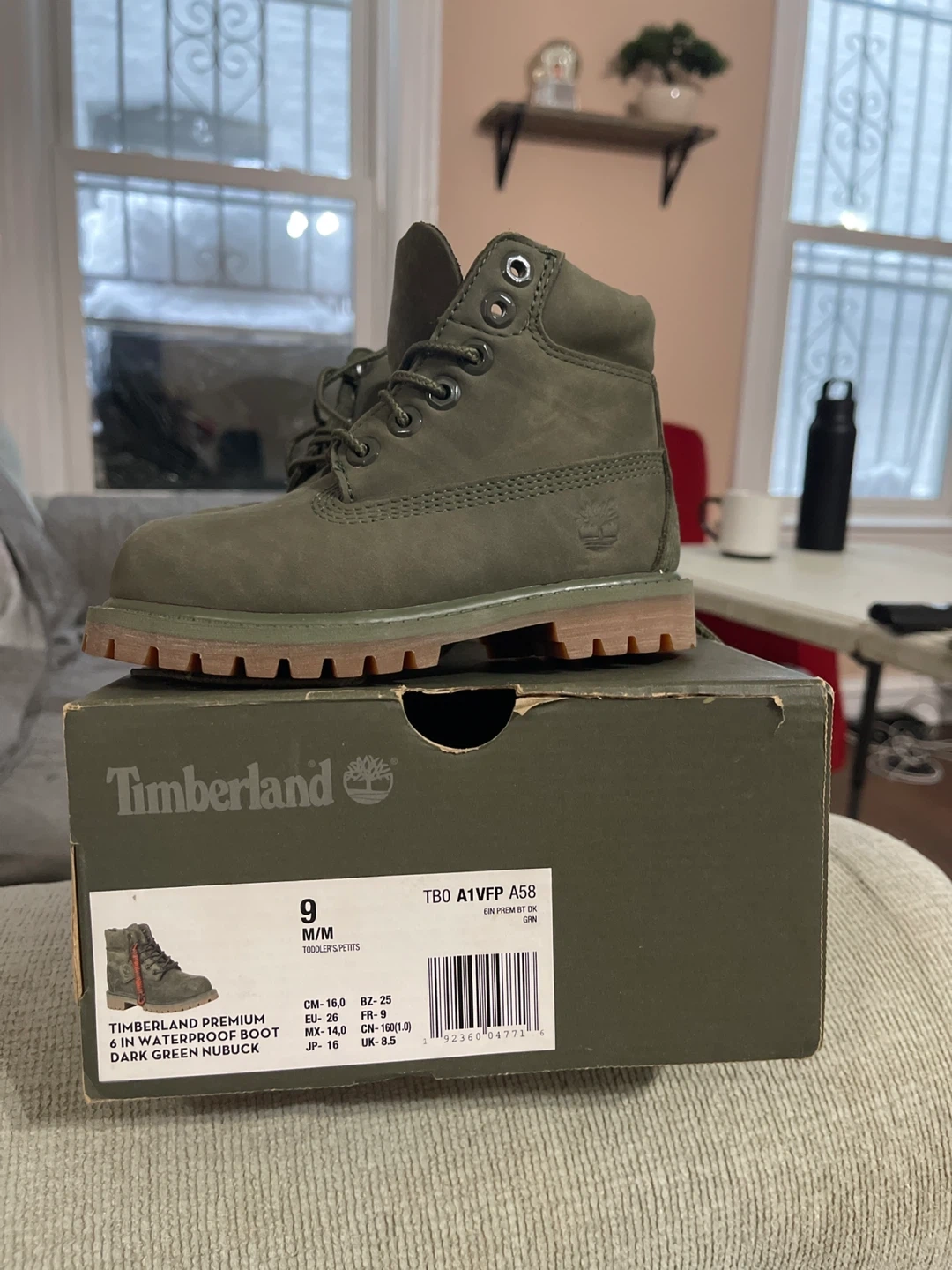 These Timberland Premium 6 Inch Waterproof Boots are in a dark green nubuck material. They're size 9 Toddler M/M. Features durable construction for little adventurers.