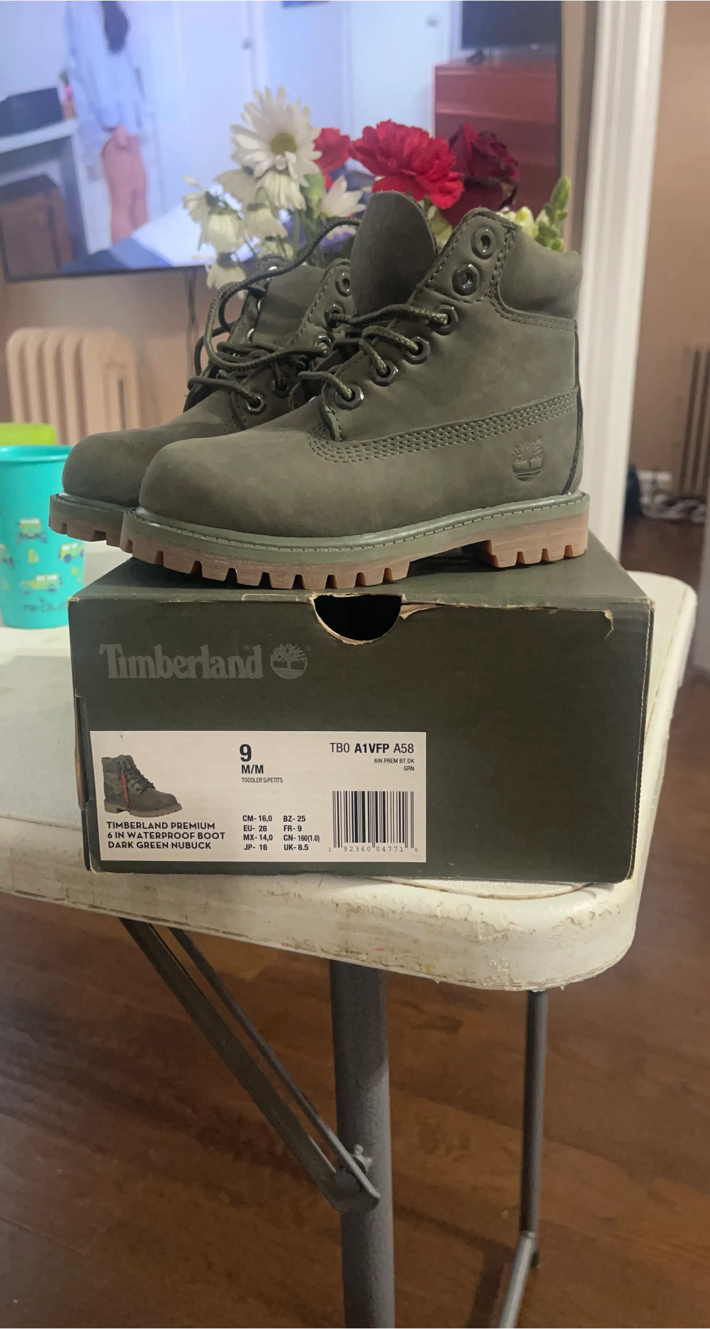 These Timberland Premium 6 Inch Waterproof Boots are in a dark green nubuck material. They're size 9 Toddler M/M. Features durable construction for little adventurers.
