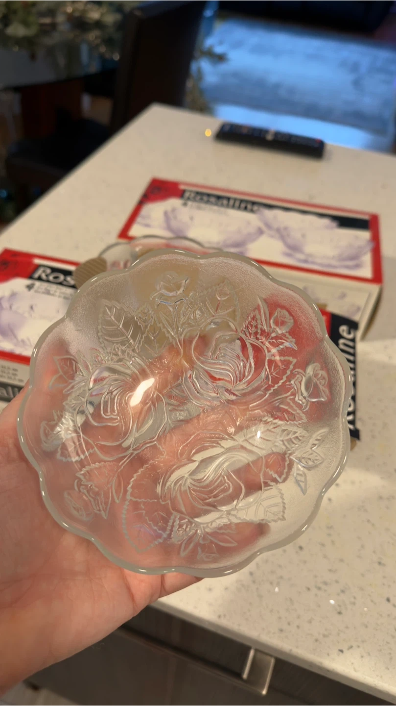 Selling a set of four Rosaline glass bowls! They feature a lovely rose design and are in great condition. The box is included, making them perfect for gifting or adding a touch of elegance to your table setting