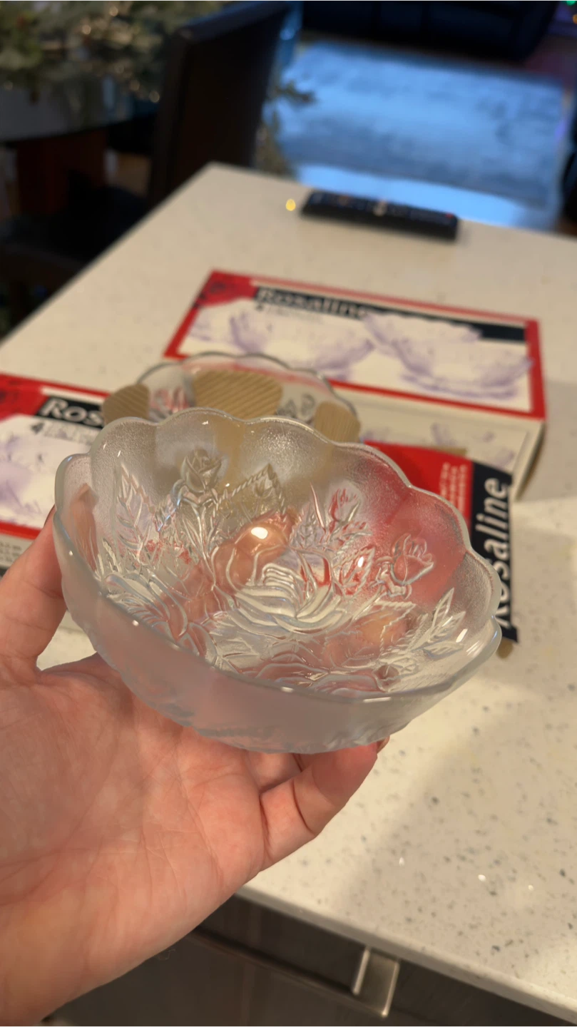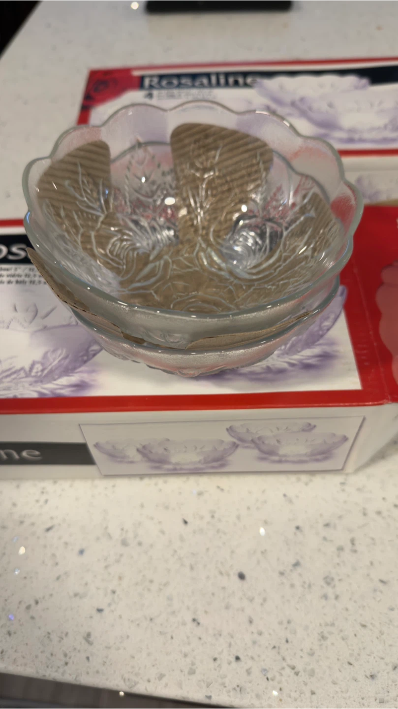 Selling a set of four Rosaline glass bowls! They feature a lovely rose design and are in great condition. The box is included, making them perfect for gifting or adding a touch of elegance to your table setting