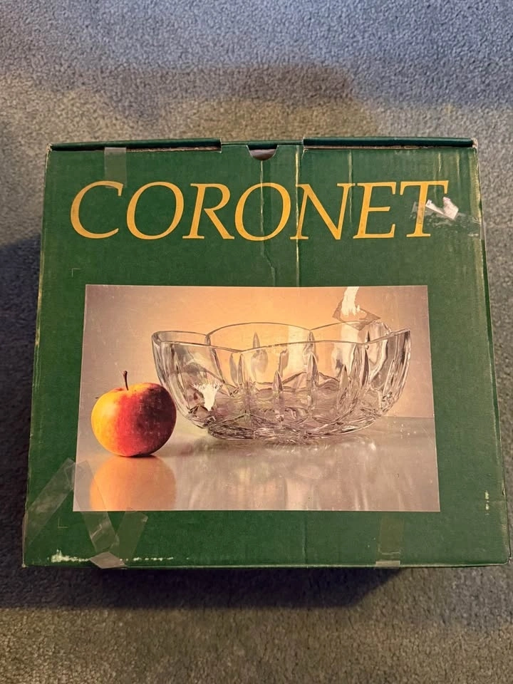 Royal Crystal Rock (RCR) Opera cut lead crystal serving bowl. The bowl is handcrafted in Italy and features a distinct diamond and vertical cut pattern. It is made from 24% lead crystal, which gives it a sparkling appearance. The design includes a round shape with a scalloped edge. It’s in the original "Coronet" branded box. Evening and weekend pickup only. Closest major intersection is Hurontario Street and Central Parkway in Mississauga.