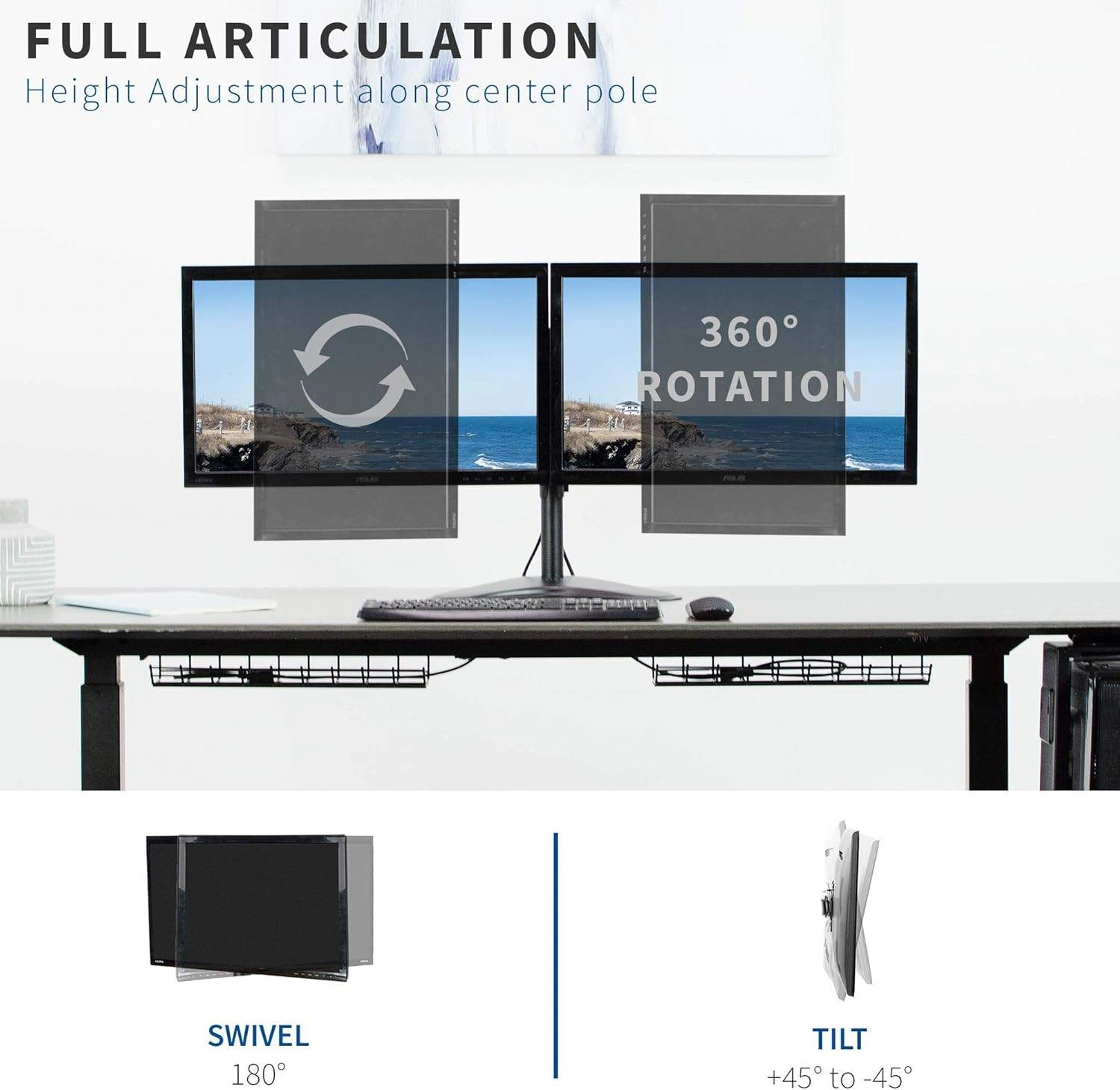 Selling a VIVO dual monitor desk mount stand. It fits most 13" to 30" screens with VESA patterns 75x75mm and 100x100mm. The pole height is 16.4" and the arm span is 31". It features full articulation with 360° rotation, 180° swivel, and +45° to -45° tilt, along with easy adjustment to turn your screen from portrait to landscape orientation with a touch