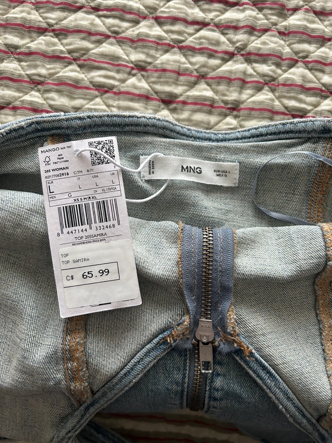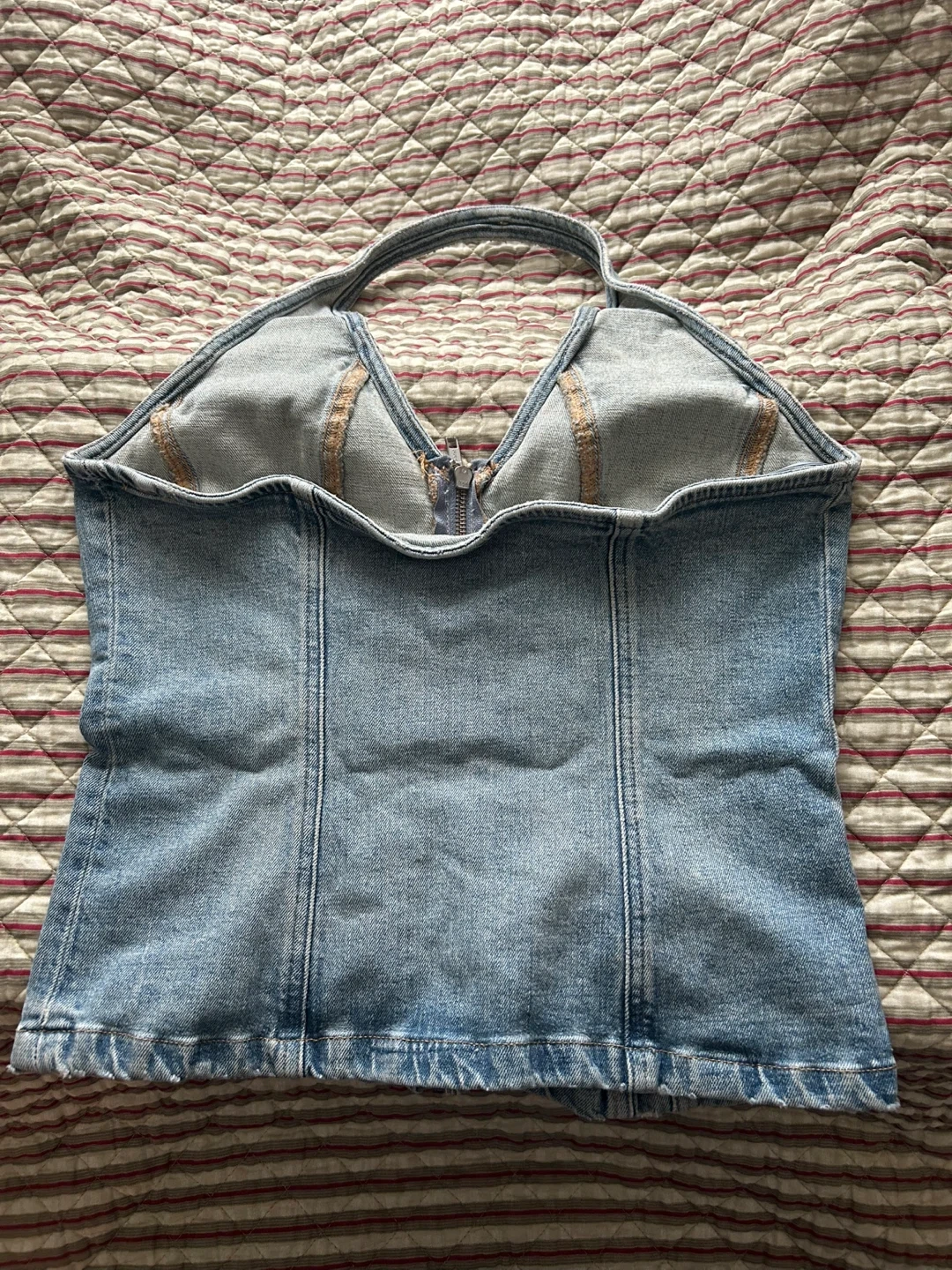 Unworn, new with tags Mango denim halter top, size large but fits more like a medium in my opinion. Wouldn’t recommend for anyone with a bigger bust :(.