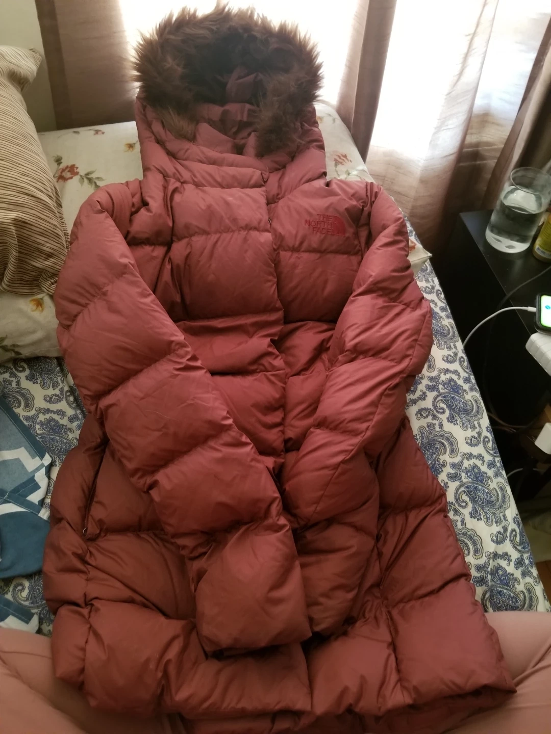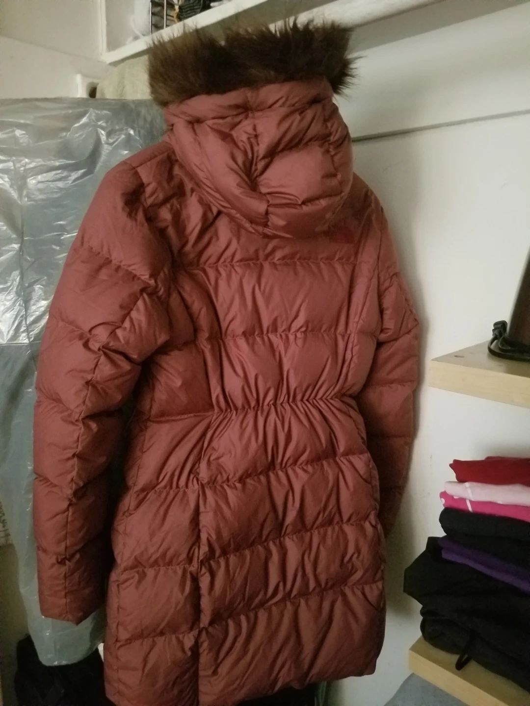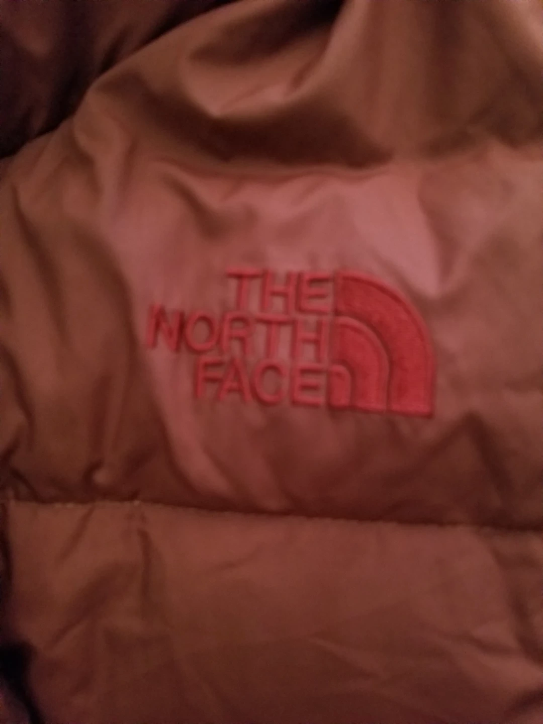 This is a warm, hooded down parka from The North Face. It's designed for cold weather. The jacket is made with quilted puffers and features a faux fur-trimmed hood.