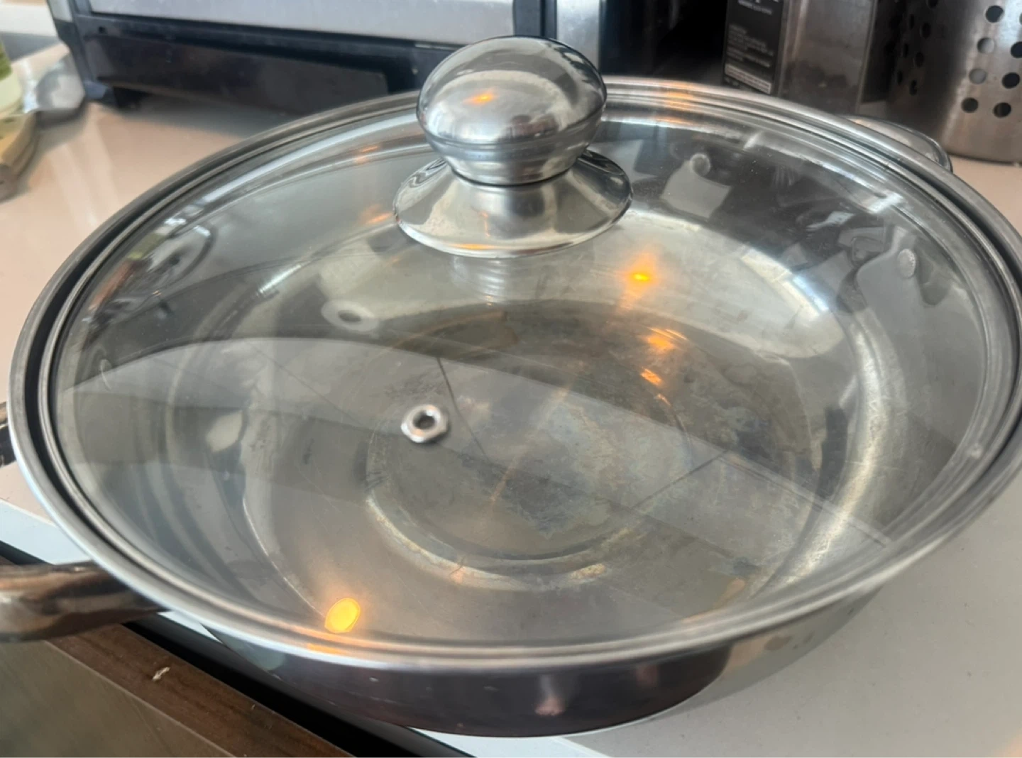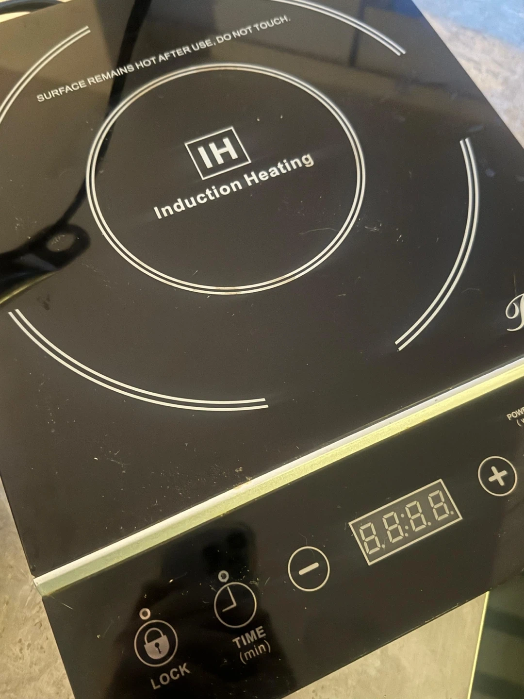 This is a Rosewill induction cooker with a stainless steel pot and glass lid. It features digital controls for time and temperature. Works great for quick meals!