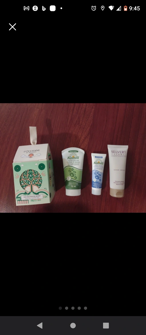 Lovely gift set includes L'Occitane shea butter soap, two Kamill hand creams, and Selvert Thermal hand cream. Perfect for travel or a small gift.