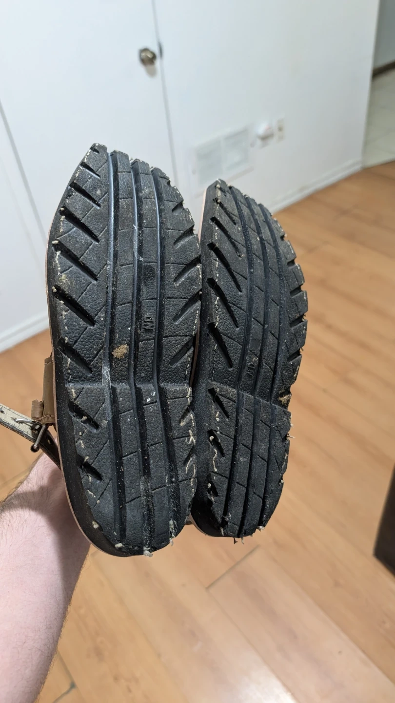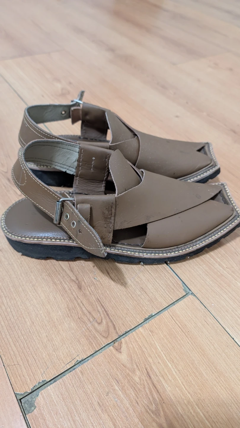 These are classic brown leather Peshawari sandals. They feature a comfortable buckle strap closure. The soles are made of durable rubber, resembling tire treads. A great choice for warm weather!