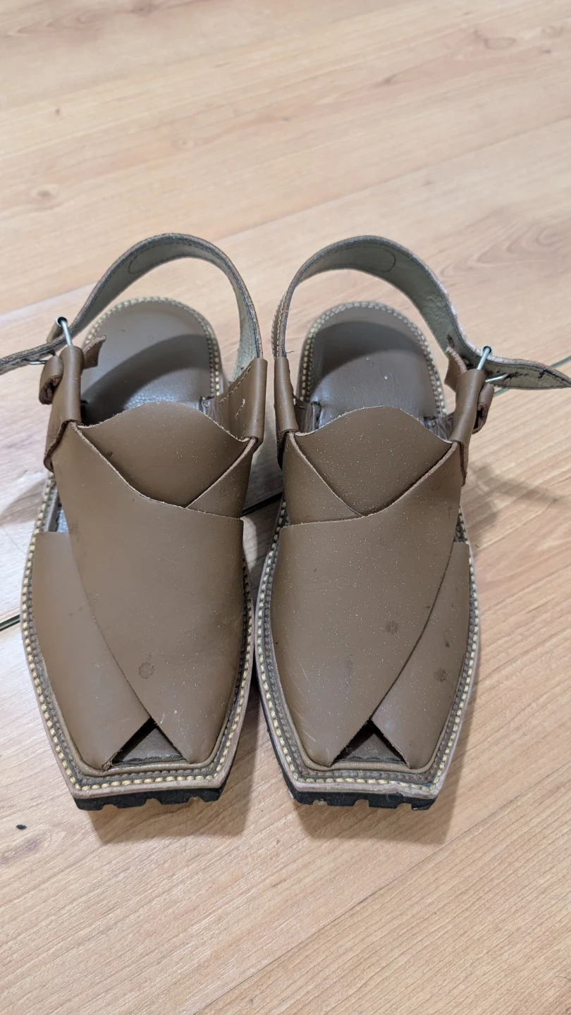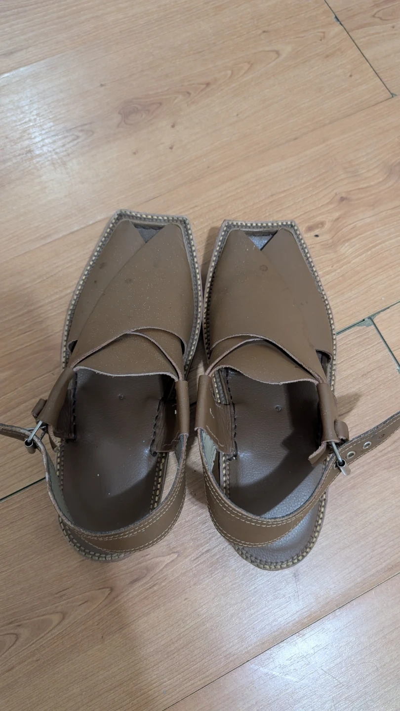 These are classic brown leather Peshawari sandals. They feature a comfortable buckle strap closure. The soles are made of durable rubber, resembling tire treads. A great choice for warm weather!