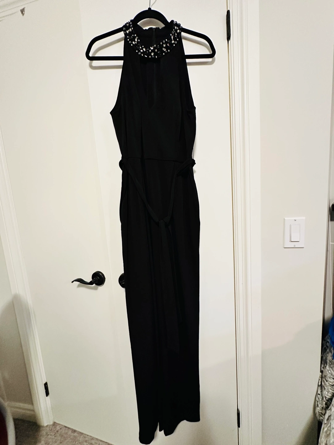 A black jumpsuit with a beaded neckline and a tie at the waist. It is a sleeveless, floor-length jumpsuit.