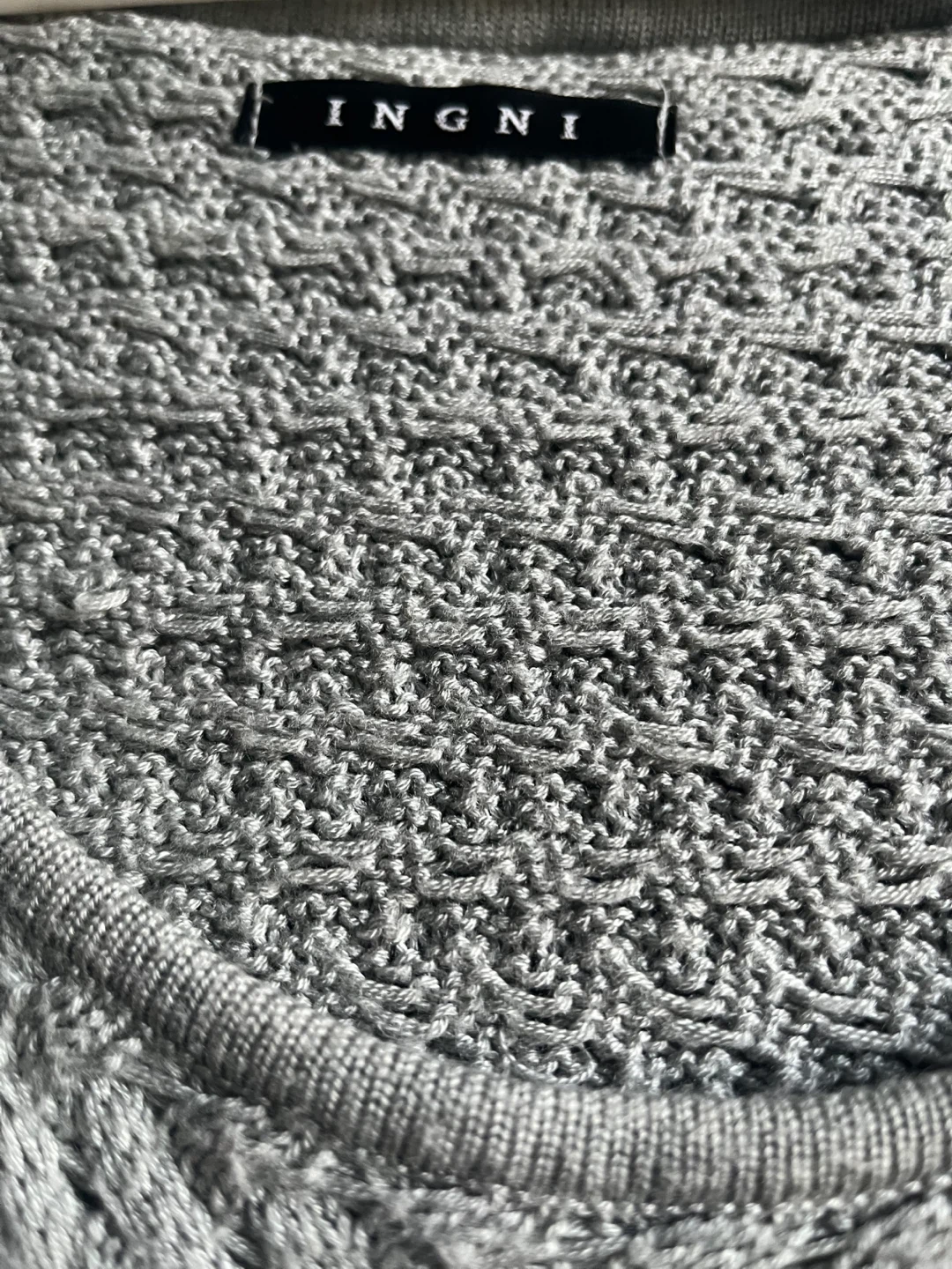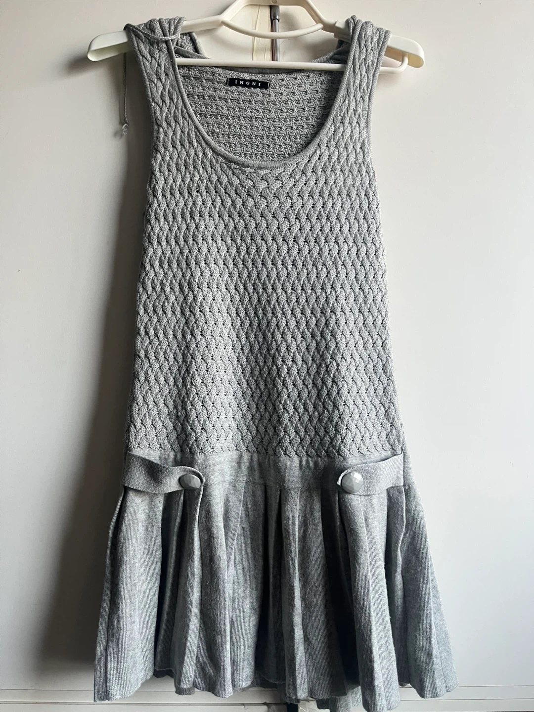A sleeveless, grey knitted hooded dress from INGNI. It features a textured knit bodice and a pleated skirt with decorative buttons. Perfect for a casual yet stylish look!