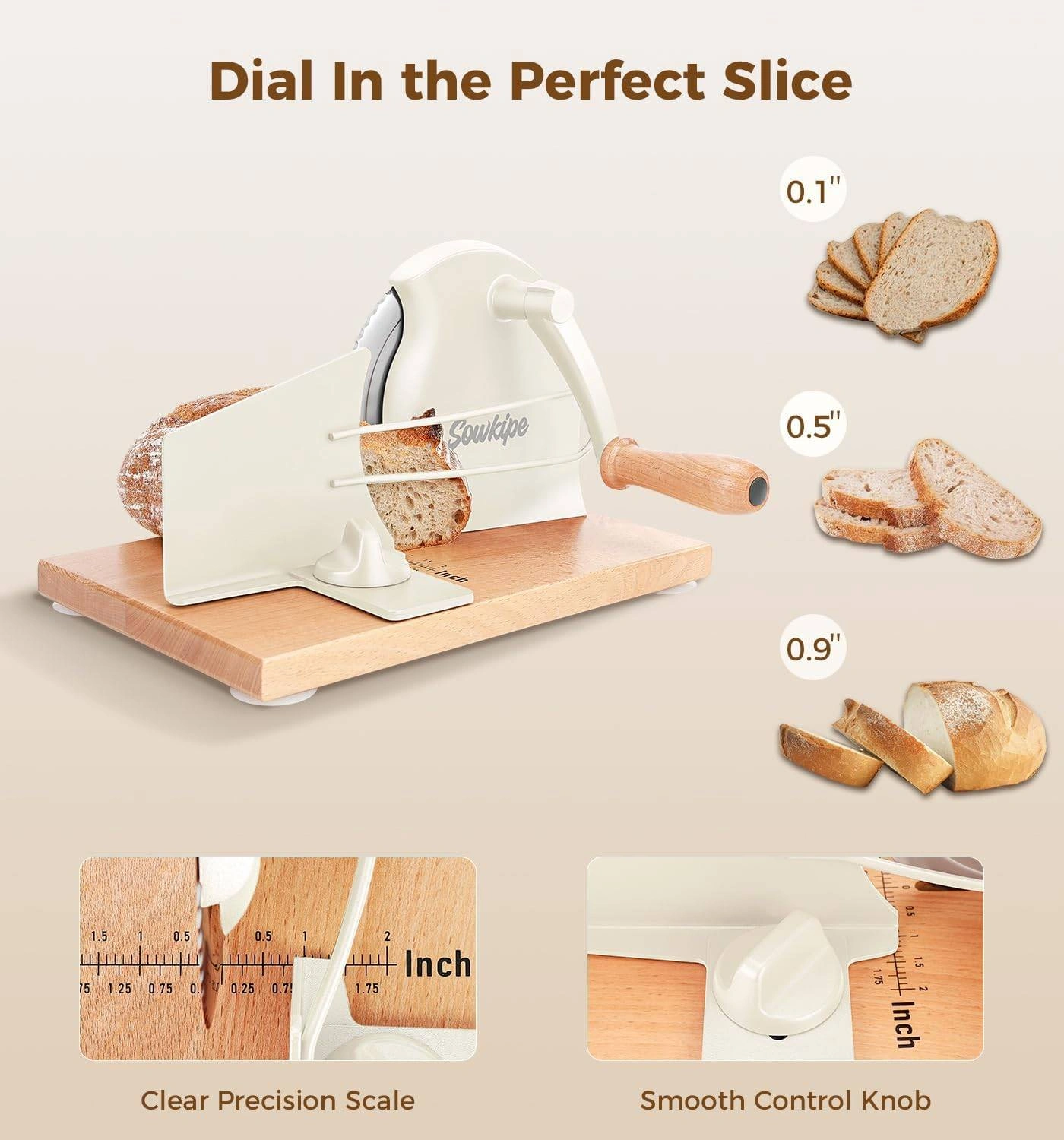 Adjust the thickness from thin to thick using the easy rotary knob—great for sandwich bread, toast, or sourdough. Suction cups on the bottom help keep it steady while in use, and the removable stainless steel blade makes cleaning quick and easy.