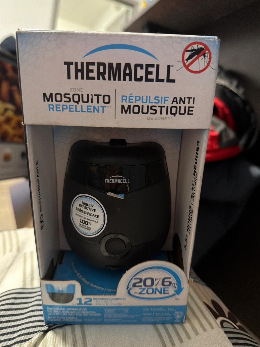 Thermacell Zone mosquito repellent. It's rechargeable and covers a 20-foot zone. Includes 12 hours of recharge and a 5.5-hour battery life. This is a domestic solution for repelling mosquitos.
