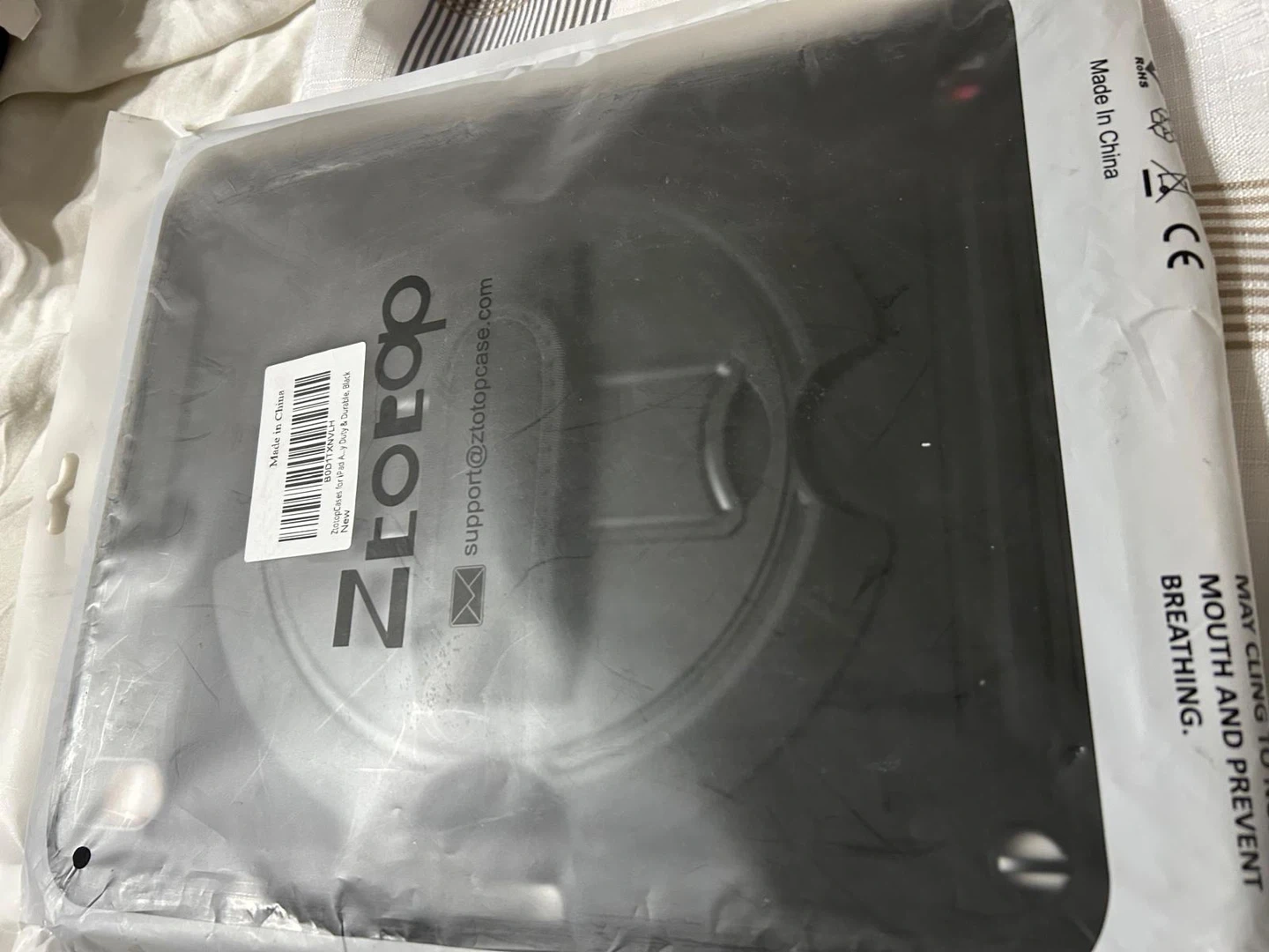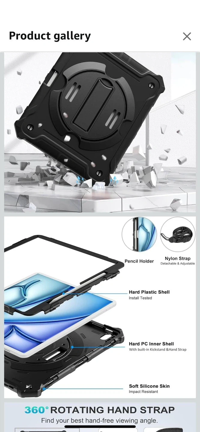 This protective case is made of high-quality TPU and silicone materials. It features a 360-degree rotating hand strap and a built-in kickstand for versatile viewing angles. The case also includes a pencil holder and a detachable, adjustable nylon shoulder strap. It's designed to be impact and drop resistant.