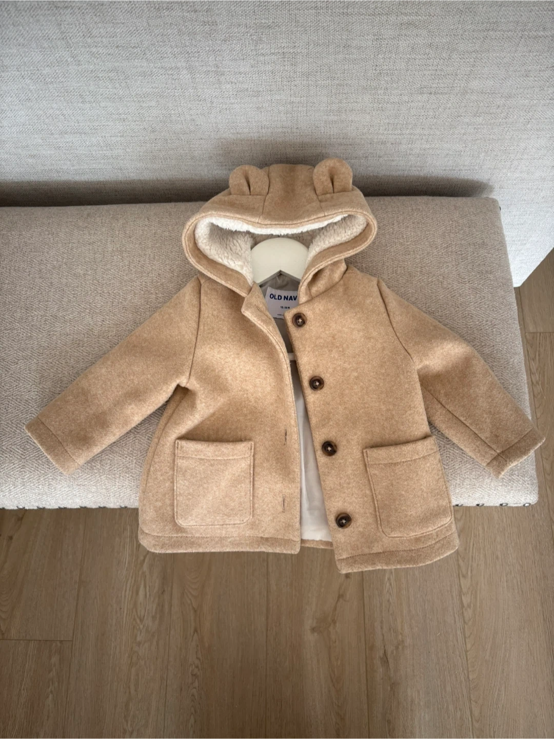 Cozy Old Navy toddler coat with a teddy bear hood detail. Made with 100% polyester shell and lining. Perfect for keeping little ones warm during cooler weather!
