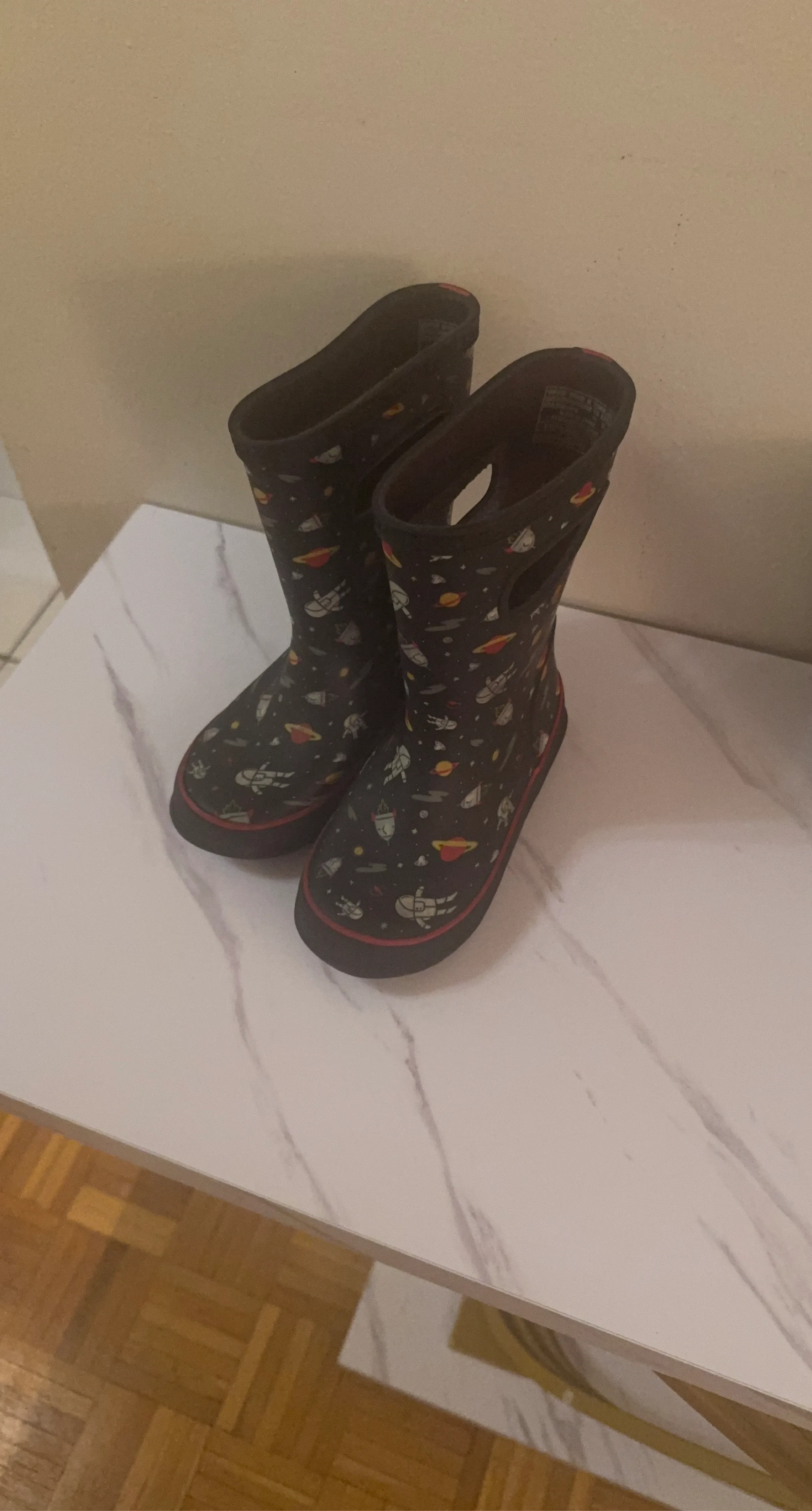 Size 11 toddlers Cute Bogs boots with a fun space print. They're waterproof and designed for kids. Perfect for puddle jumping and rainy days!