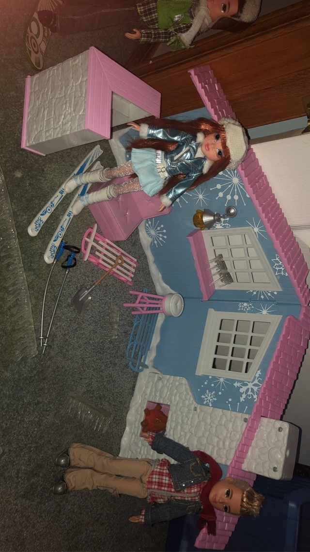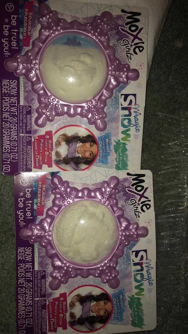 Moxie girlz magic snow cabin comes with two packets of magic snow that you mix with water to turn into fake snow. Has a snowboard and skis that come off and can fit into any of the dolls feet. You can even make it snow by loading the chimney with the special snow powder (shown in photo) to send it into the air. They don’t make these dolls anymore so they go for $100 or over that just for one of the girl dolls and I can sell dolls separately. Instructions included. $170 for all I also have an unopened Moxie girlz remote control skating rink with Lexa doll if interested.
