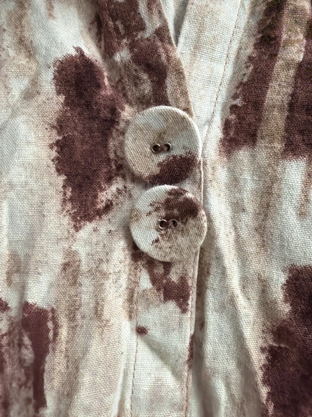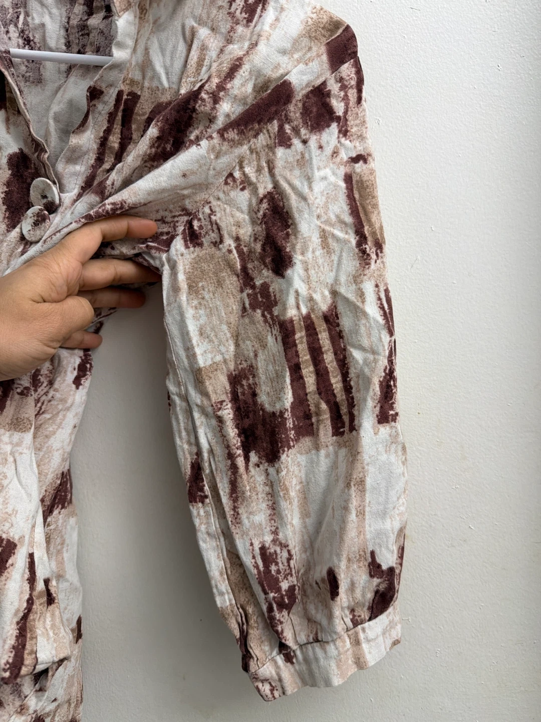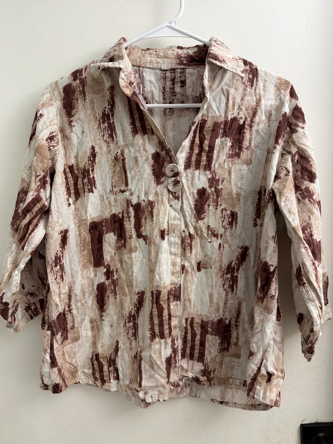 This women's shirt features a unique abstract print in brown and beige tones. It has a collared neckline with two button closures at the front. The sleeves are cuffed. A stylish piece for any casual occasion!
