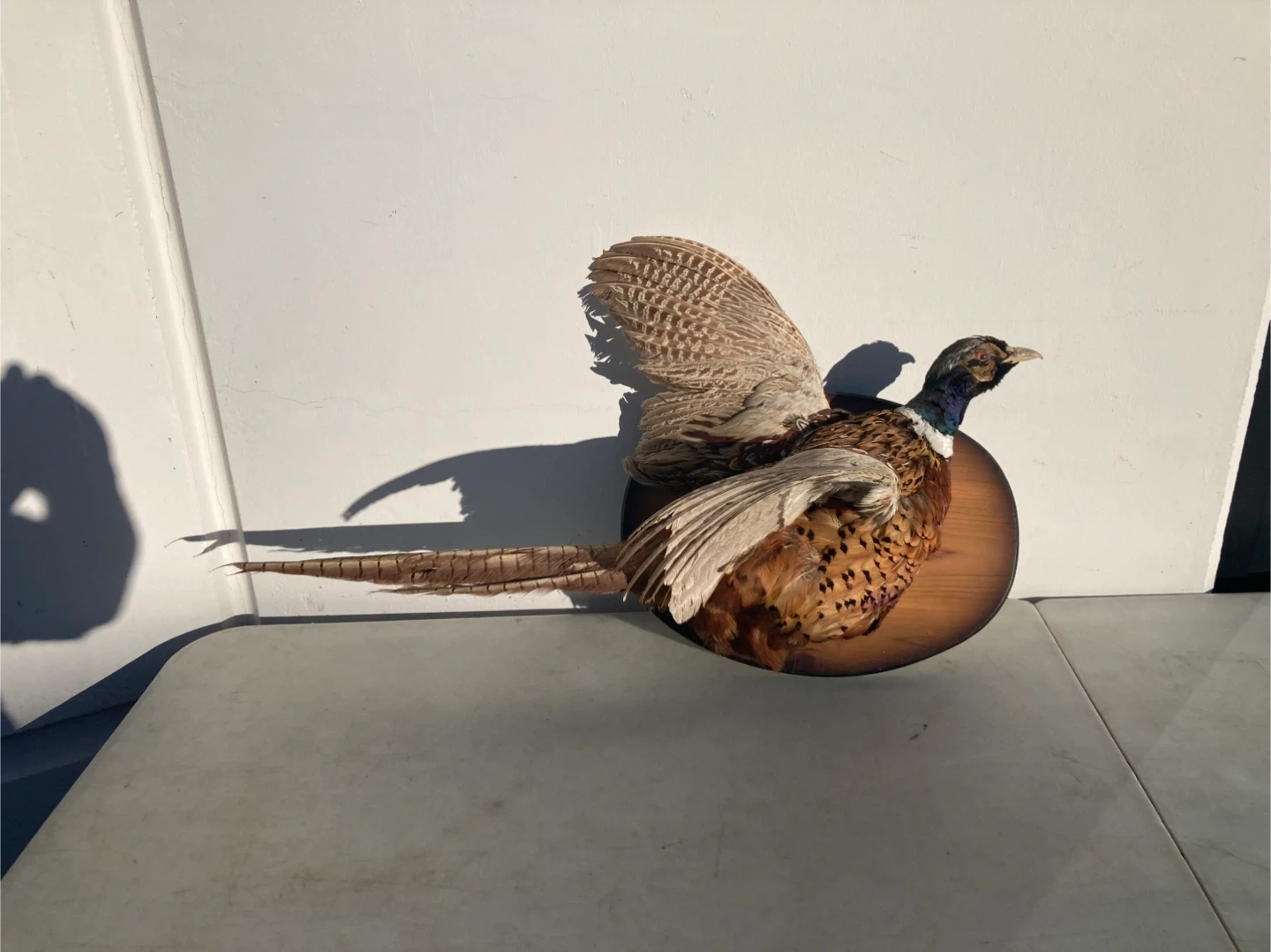 A beautiful taxidermy mount of a male pheasant, displayed on a wooden plaque. Its intricate feather details and vibrant plumage are well-preserved. This piece would make a striking addition to any cabin or wildlife enthusiast's collection.