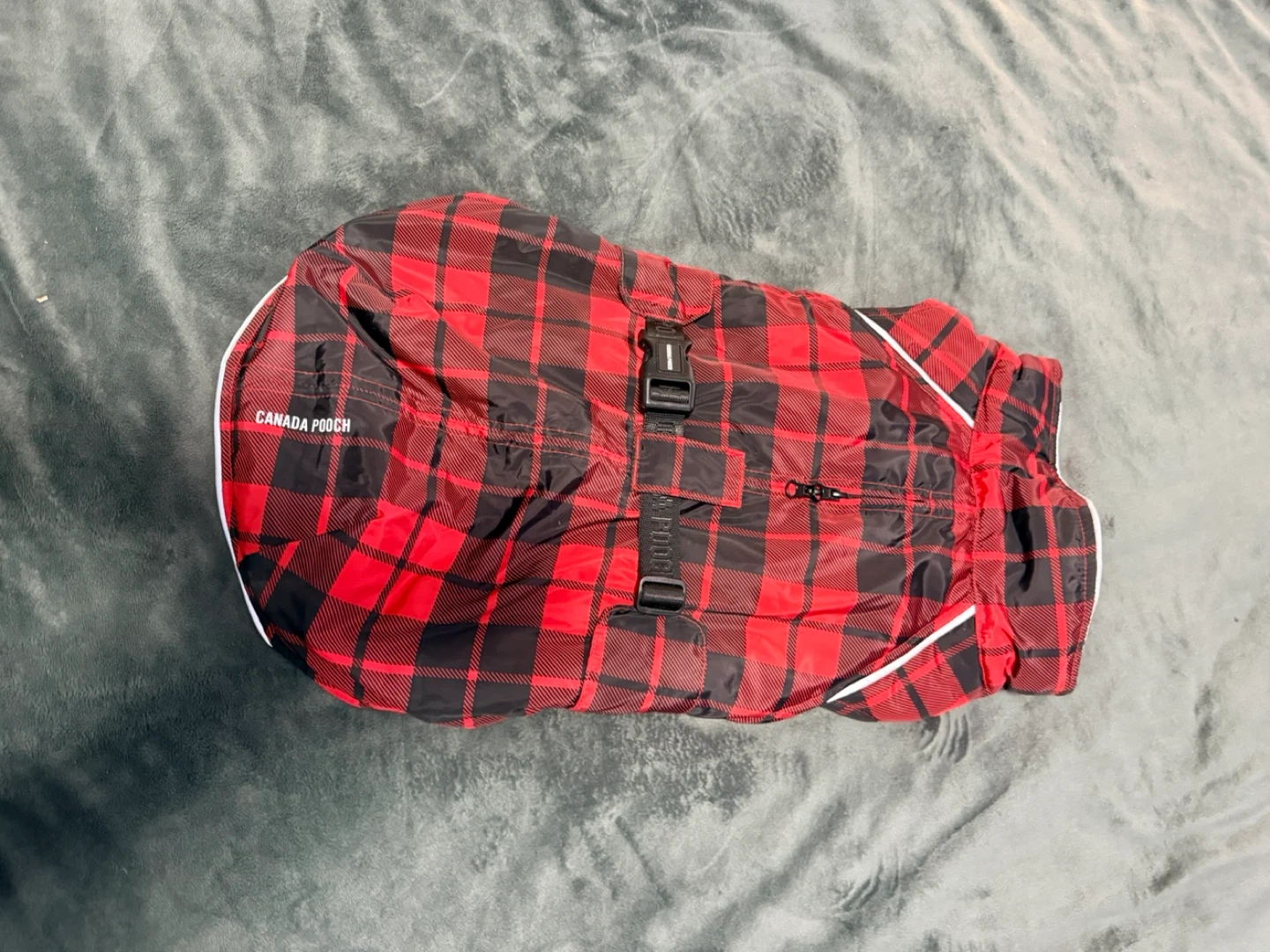 This Canada Pooch dog jacket features a classic red and black plaid design. It has a zip closure and adjustable straps for a comfortable fit. It's insulated for warmth on chilly days!