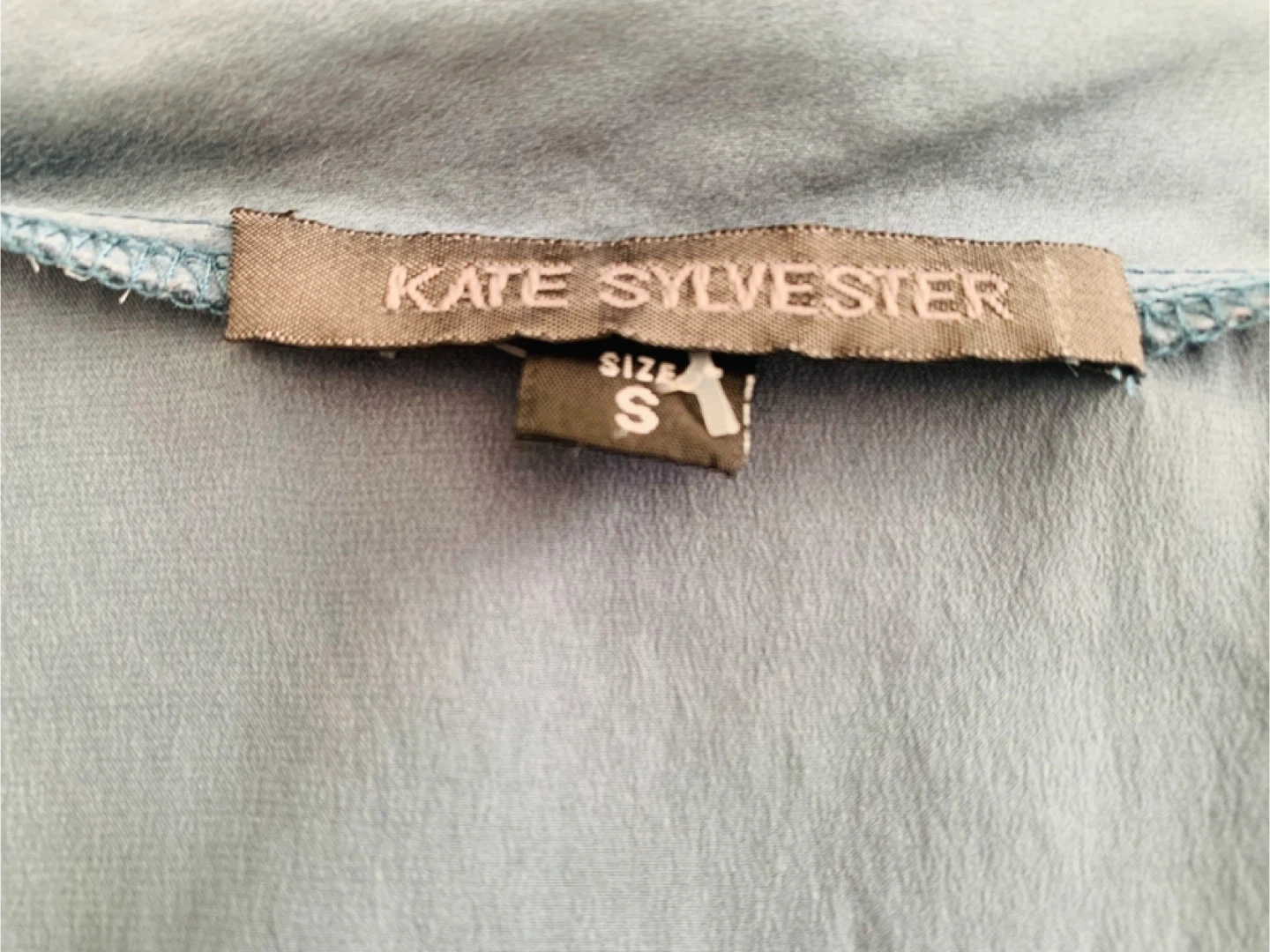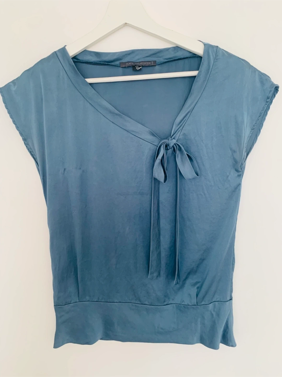 This Kate Sylvester top is made from 100% silk. It features an asymmetric V-neck with a tie detail. Size is small.