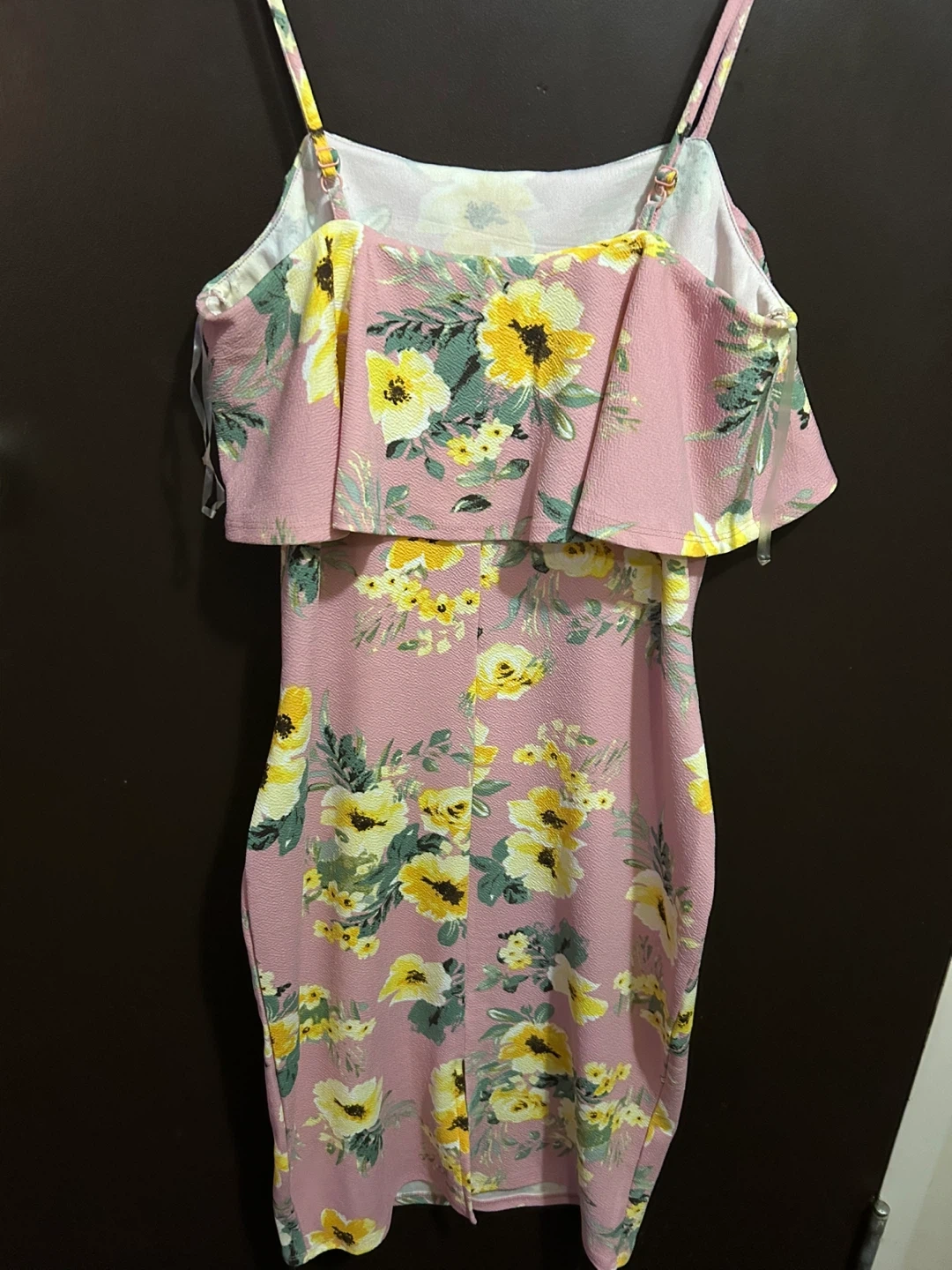 Selling a pretty floral pink dress! It's perfect for a summer day or a night out. The dress has a lovely floral pattern with yellow and white flowers on a pink background. It's in great condition and ready for a new home!