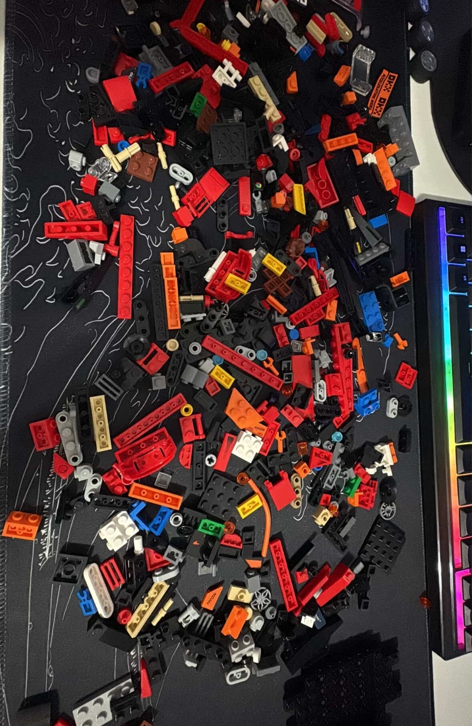 Assorted Lego building bricks in various colours including red, black, and yellow. These are individual bricks for creative building. Plenty of pieces for custom creations!