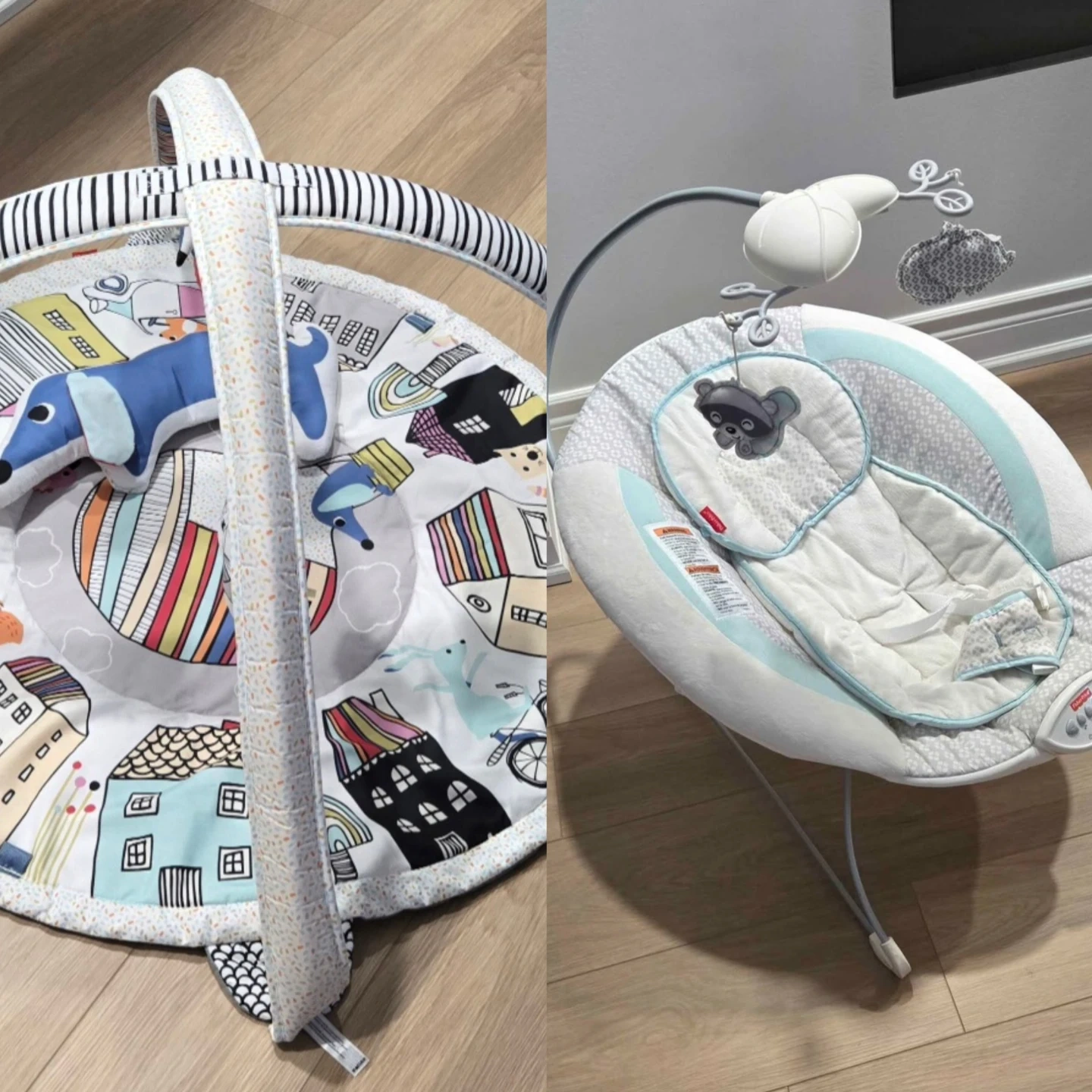 Fisher-Price Deluxe Bouncer and Play Gym set for babies. Includes a comfy bouncer with a toy bar and a round play mat with soft arches and hanging toys. Perfect for tummy time and playtime! Take both for $25.