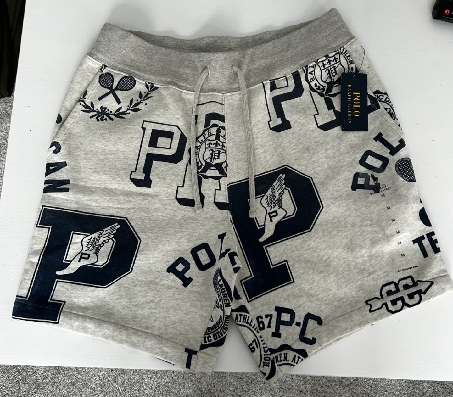 Polo Ralph Lauren sweat shorts in a heather grey with an all-over 'P' and 'Polo' graphic print. These shorts feature an elastic waistband with a drawstring and a relaxed fit. The material is a soft cotton blend, perfect for casual wear. They're a size medium.