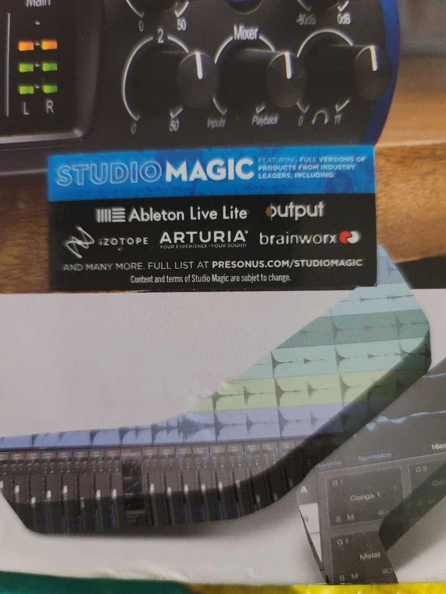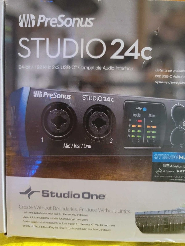 Brand new PreSonus Studio 24c, a 24-bit/192 kHz USB-C audio interface, perfect for recording studios. Pristine, unused condition, still in original packaging. Features 24-bit/192 kHz resolution, USB-C connectivity, and XMAX-L mic preamps for clear recordings. Open to offers and trades. Please check out my other listings for bundle discounts.