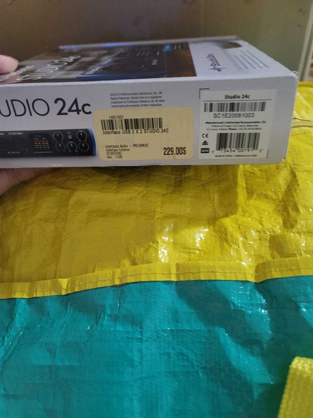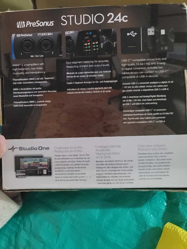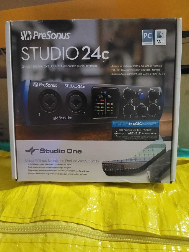 Brand new PreSonus Studio 24c, a 24-bit/192 kHz USB-C audio interface, perfect for recording studios. Pristine, unused condition, still in original packaging. Features 24-bit/192 kHz resolution, USB-C connectivity, and XMAX-L mic preamps for clear recordings. Open to offers and trades. Please check out my other listings for bundle discounts.