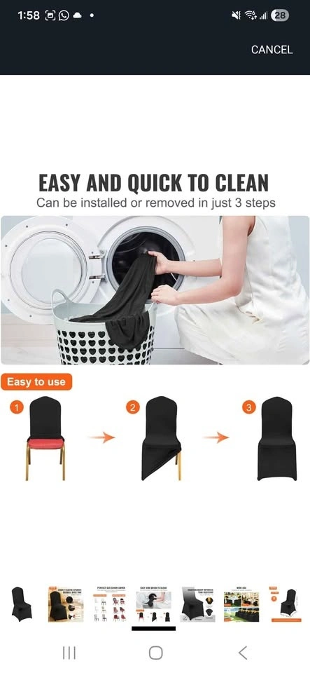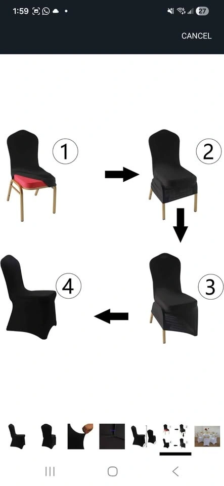 Black Stretch Spandex Chair Covers, 22 PCS. Perfect for banquets, parties, or any dining event. Universal fit. These are premium scuba elastic covers. Used only 4 to 5 covers, so they are almost brand new. Selling each for $2, or make a deal to take all 22. From a pet-free and smoke-free home.