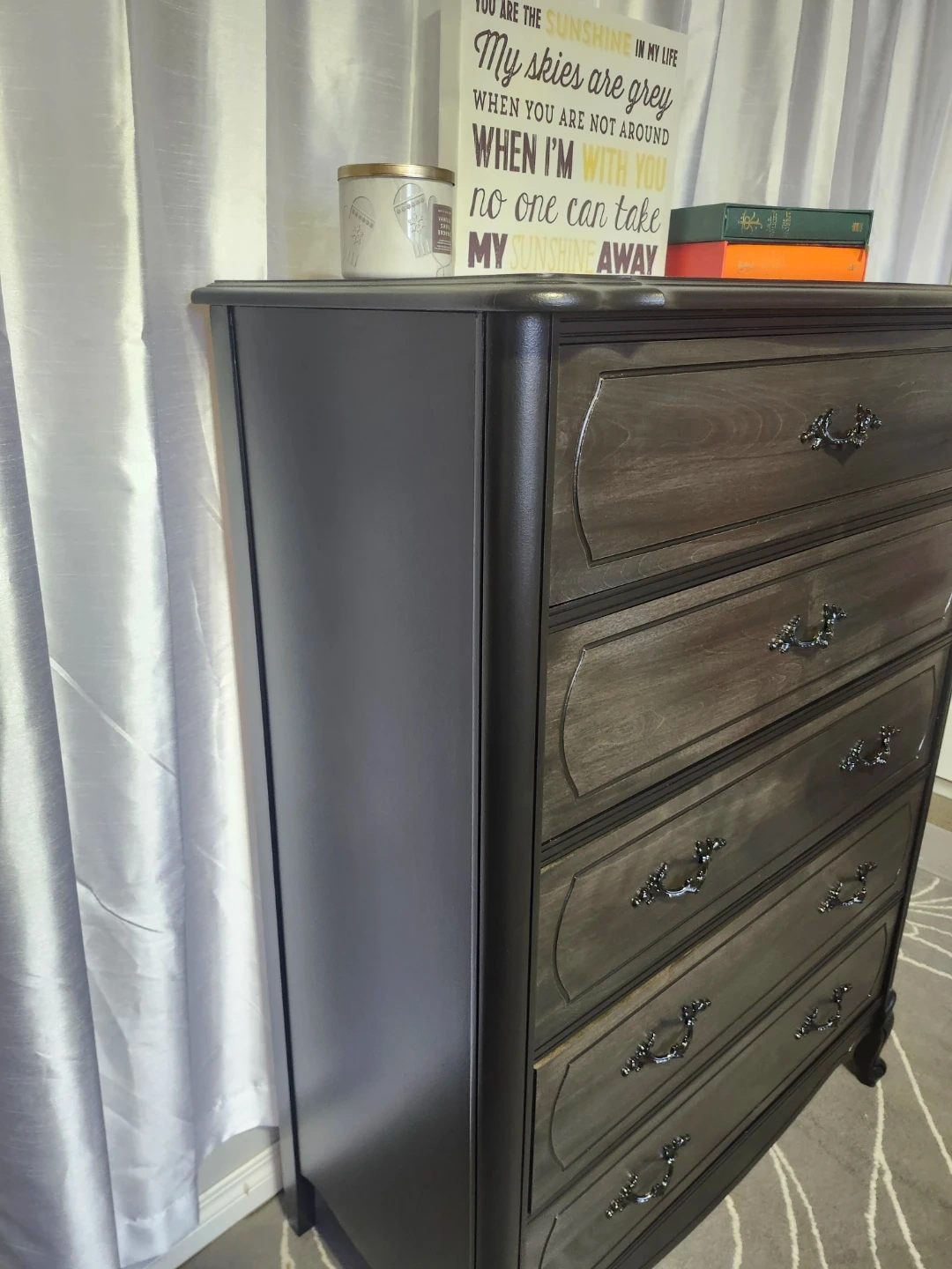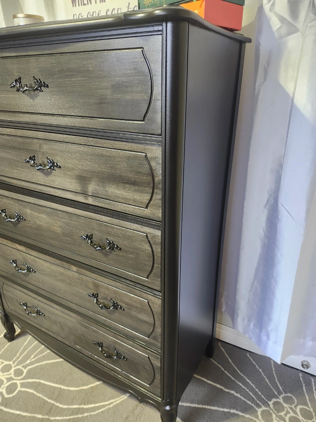 This dresser has a dark wood finish with ornate black hardware. It features five spacious drawers for storage. The top and frame are a matte black, contrasting with the stained maple wood drawer fronts. All drawers slide perfectly. Delivery can be arranged