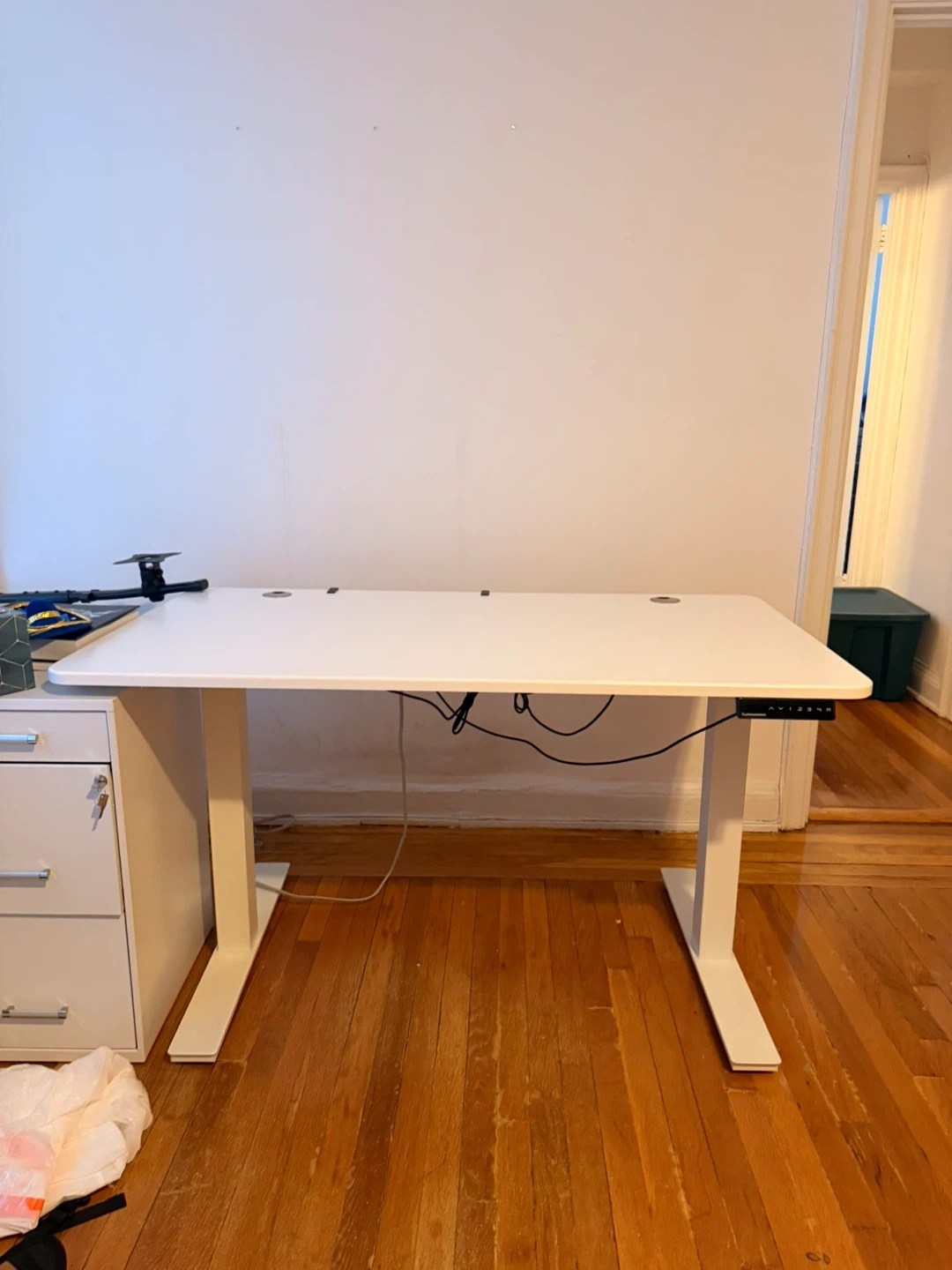 This is an Autonomous electric standing desk. It's white with a white oak surface. The desk features a programmable control panel for height adjustment.
