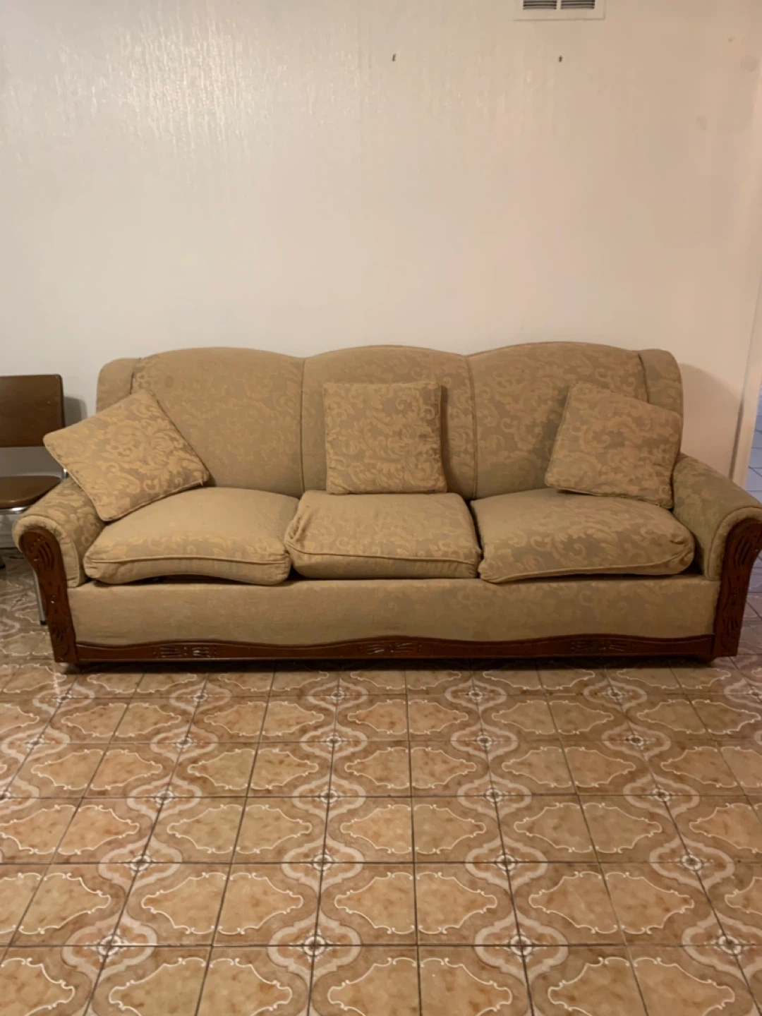 Selling a sofa with a beige floral pattern. It comes with matching throw pillows. The sofa has a wooden trim along the bottom. Pull out bed
