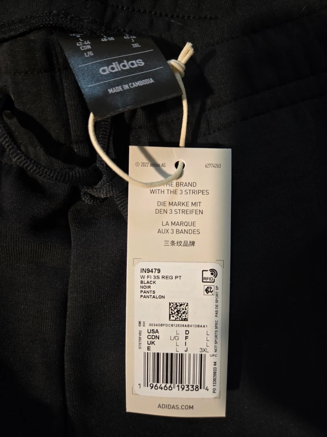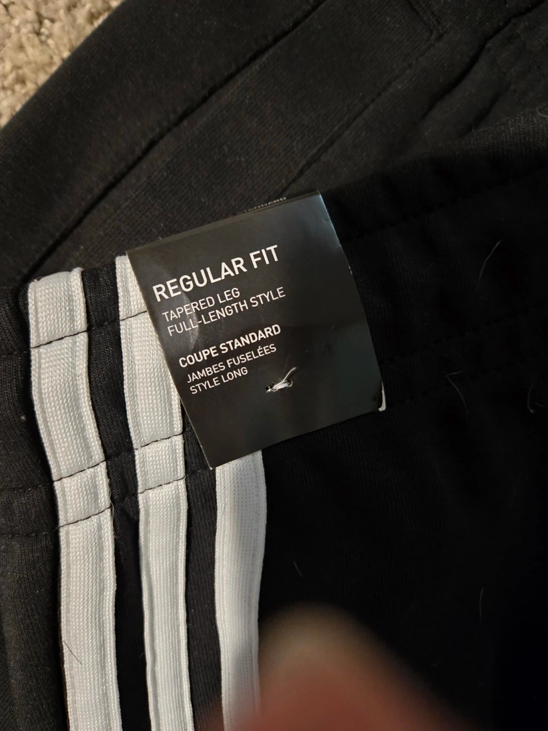 These are Adidas black pants with a regular fit and tapered leg. They feature the classic three stripes. Made for full-length style.