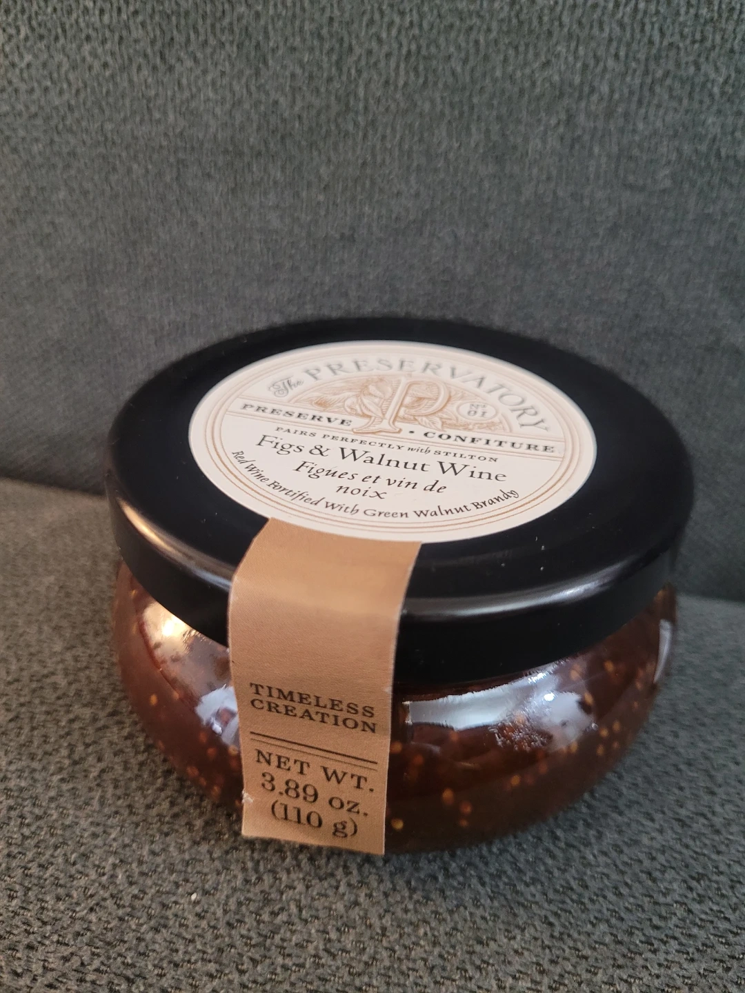 The Preservatory Figs & Walnut Wine preserve. Red wine fortified with green walnut brandy. Net wt. 3.89 oz (110 g). Pairs perfectly with Stilton cheese. It's a delightful addition to cheese boards!