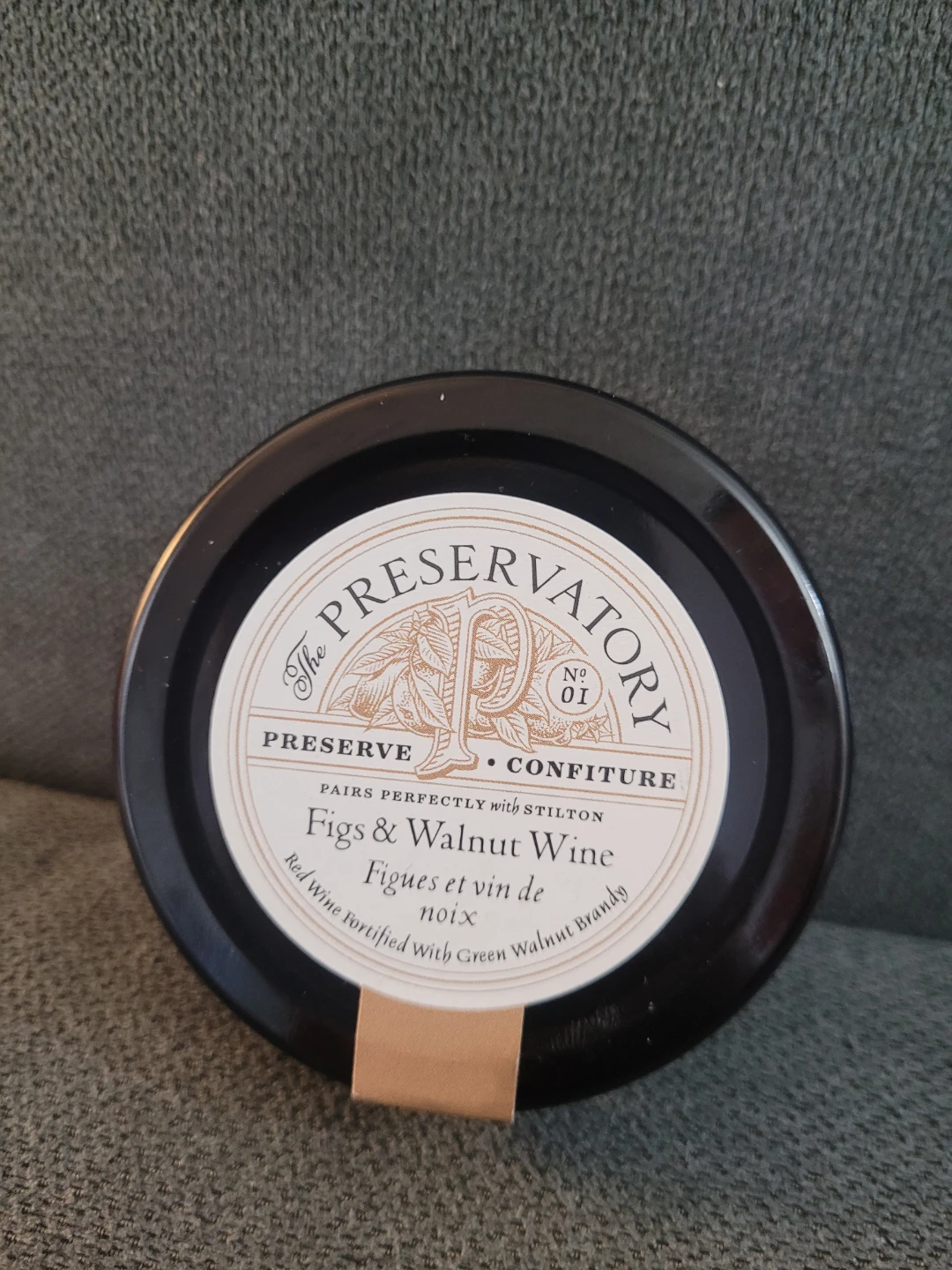 The Preservatory Figs & Walnut Wine preserve. Red wine fortified with green walnut brandy. Net wt. 3.89 oz (110 g). Pairs perfectly with Stilton cheese. It's a delightful addition to cheese boards!