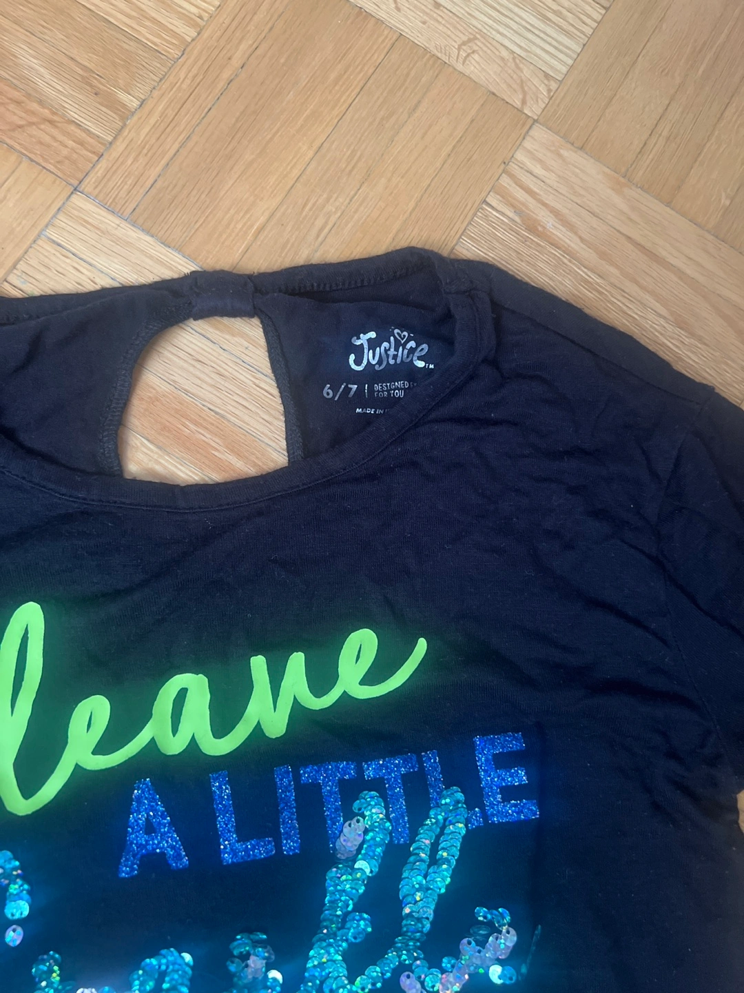 A cute black long sleeve top from Justice for girls, size 6/7! It features a fun design that says 'Leave a Little Sparkle Wherever You Go'. Perfect for adding a bit of sparkle to any outfit!
