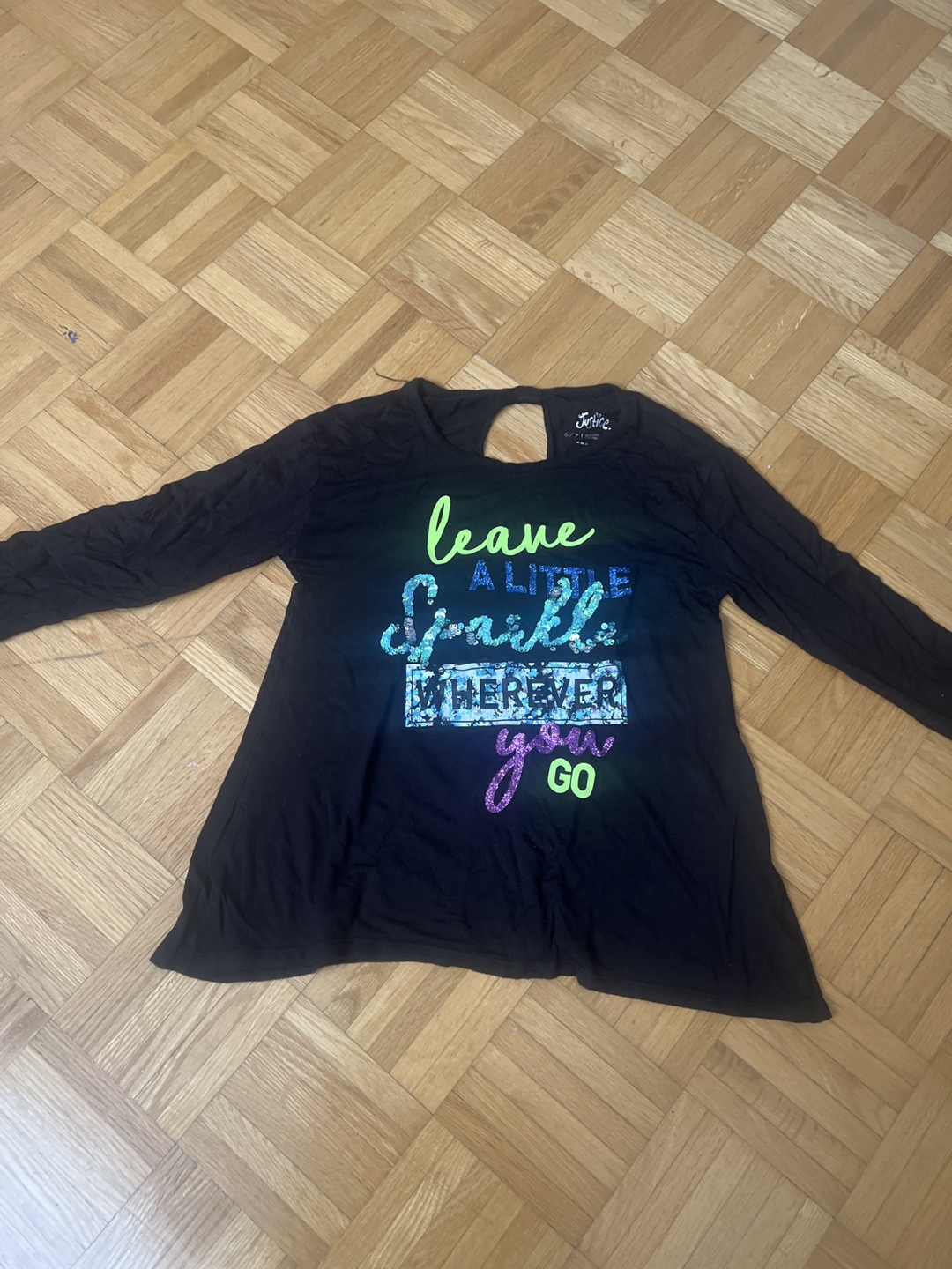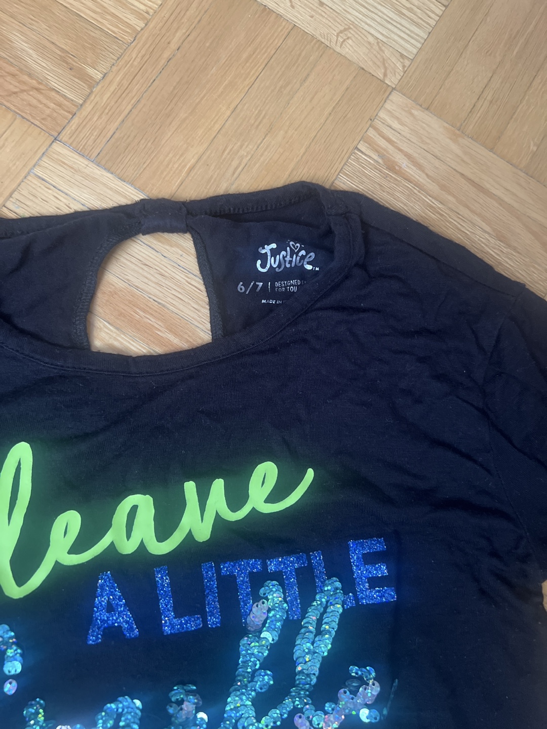 A cute black long sleeve top from Justice for girls, size 6/7! It features a fun design that says 'Leave a Little Sparkle Wherever You Go'. Perfect for adding a bit of sparkle to any outfit!