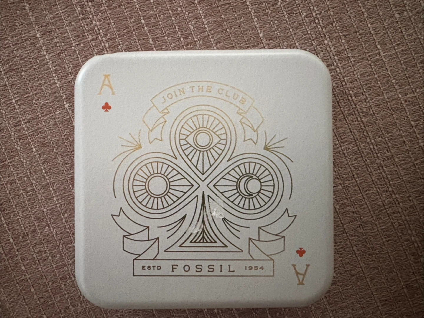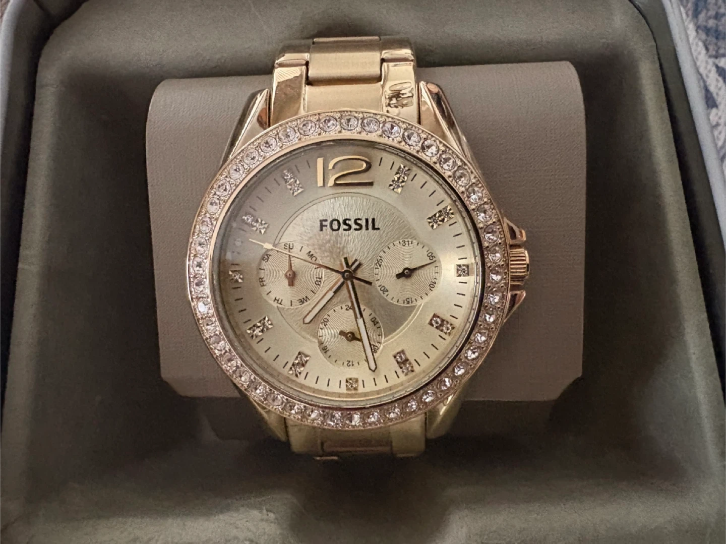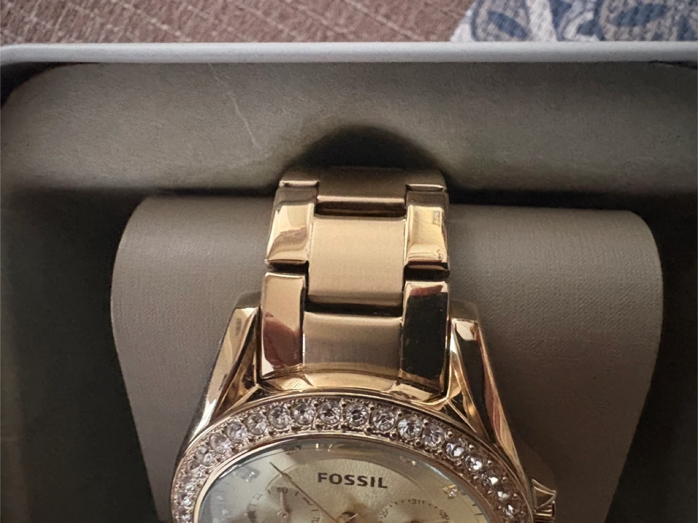 This is a Fossil women's watch with a gold-tone finish and a sparkling crystal-embellished bezel. It includes the original tin storage case. This watch would be great for adding a touch of glam to any outfit! Never worn.