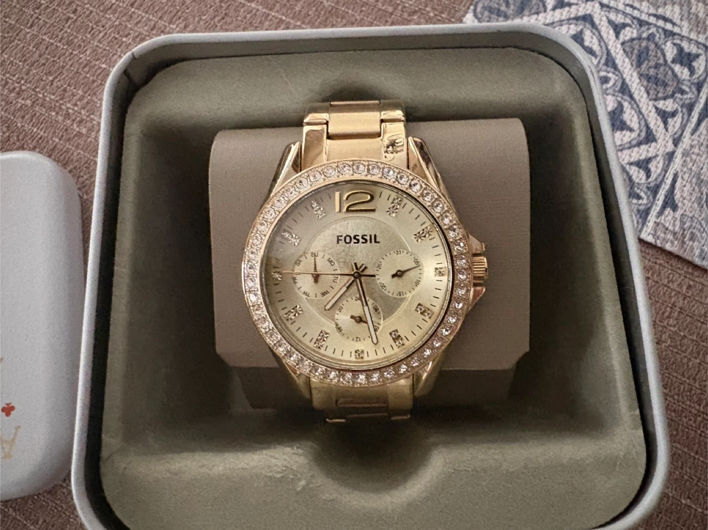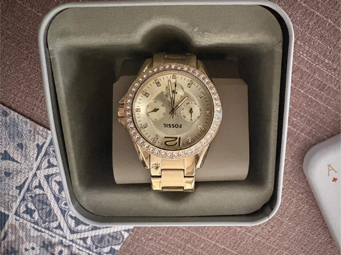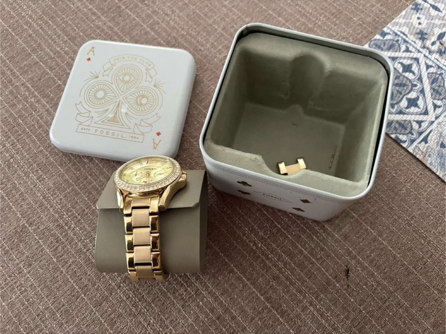 This is a Fossil women's watch with a gold-tone finish and a sparkling crystal-embellished bezel. It includes the original tin storage case. This watch would be great for adding a touch of glam to any outfit! Never worn.