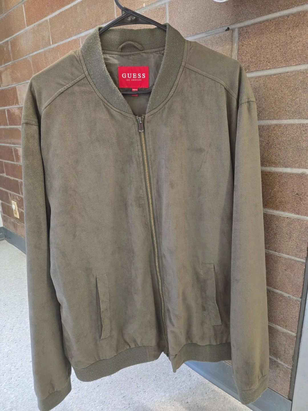 This is a GUESS bomber jacket in olive green. It's made in China and comes in size XXL. Its fabric has a suede-like texture.