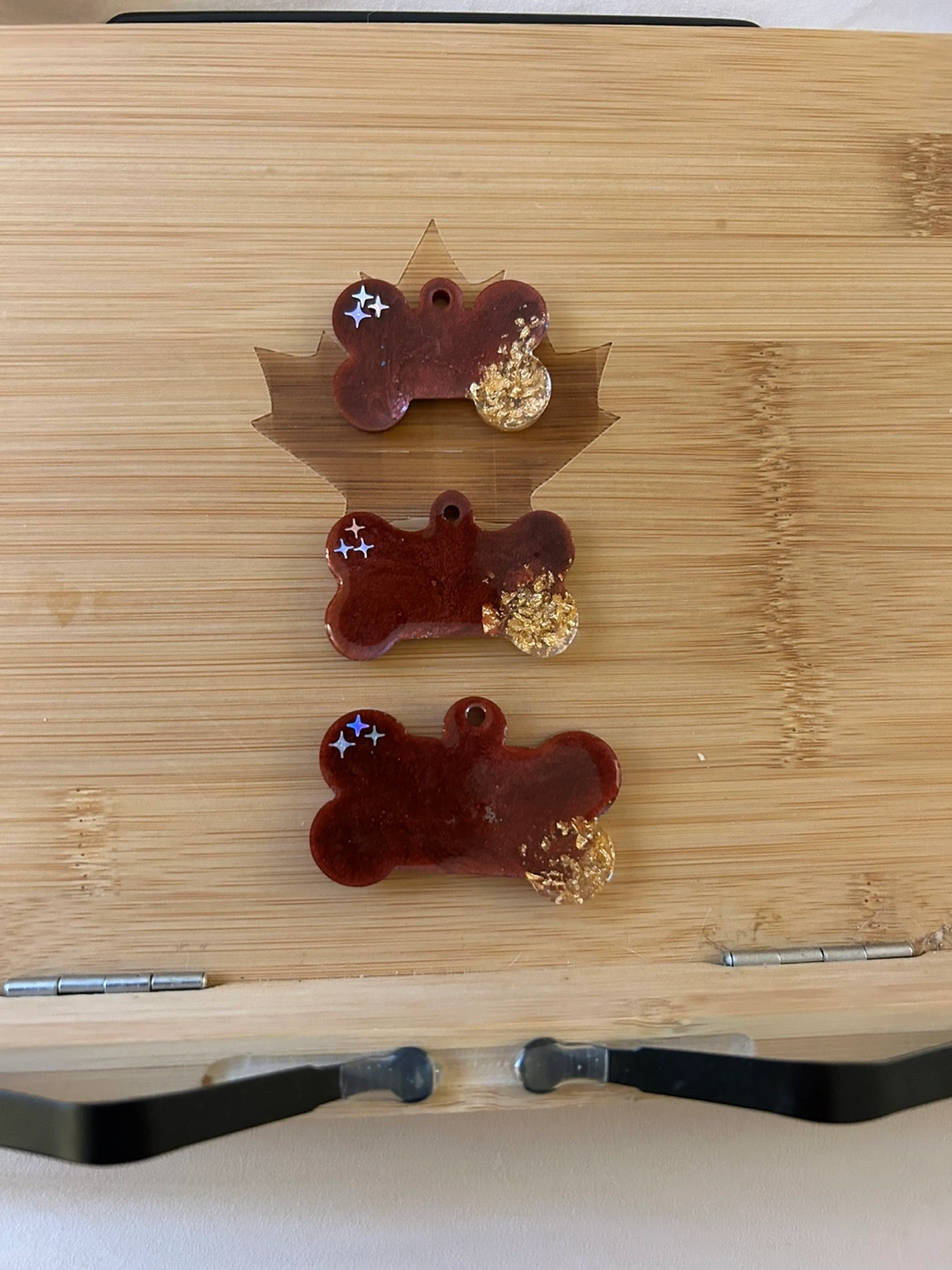 Set of three handmade bone-shaped pet ID tags. Burgundy resin with gold flakes and iridescent accents. Perfect for your furry friends. Available in small , medium, large. Your pet name and phone number can be customized. Message me for further details