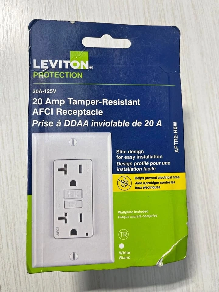 Brand new in box. Model: AFTR2-W. Retail price was $32.17 with tax. Selling for $25. Pickup is at the main intersection of Islington and Rexdale in Etobicoke. Cash only. Potentially dangerous arc faults are often unseen and may be caused by damaged wiring or a host of other conditions. Leviton Arc Fault Circuit Interrupter (AFCI) Outlets detect hazardous arc-faults and interrupt power to protect your home and family from the risk of electrical fires. AFCIs should be installed in all living areas such as living rooms, bedrooms and kitchens as required by the National Electrical Code (NEC).