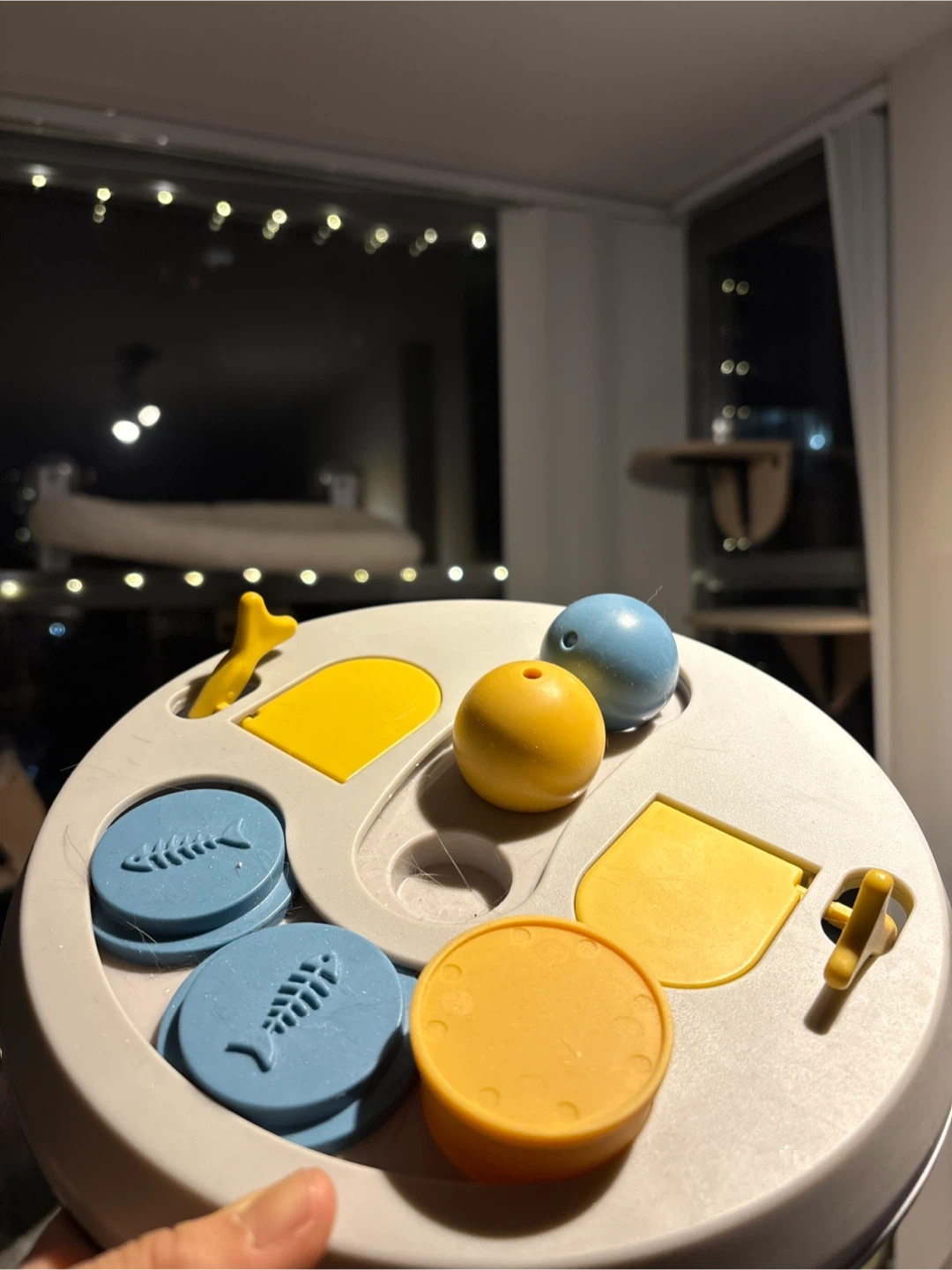 This cat puzzle toy features multiple compartments for treats. It's made of durable plastic in grey, yellow, and blue. The toy is designed to challenge your cat’s mind and encourage slower eating.