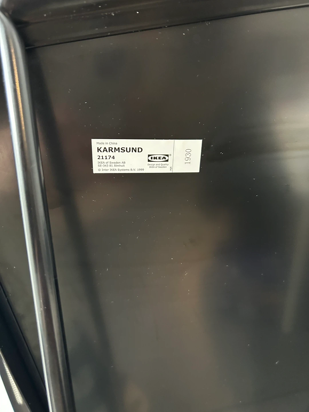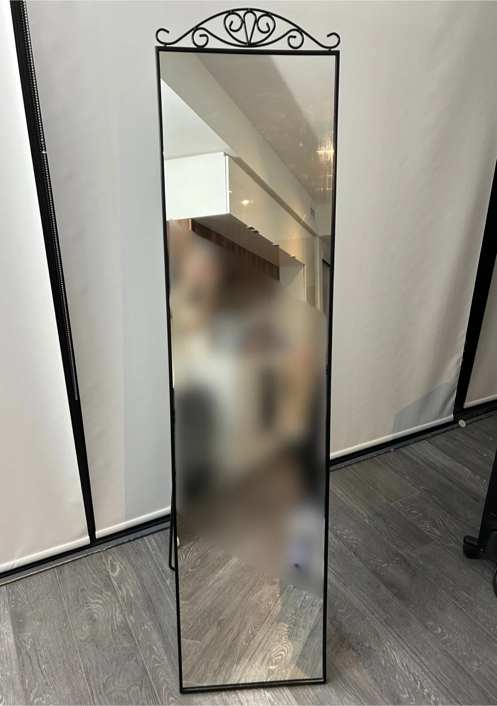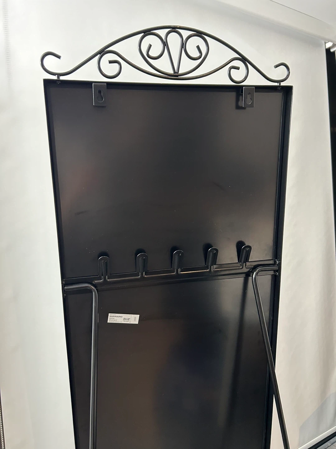 Full-body mirror from IKEA. Crown on top of mirror is removable and it is held up by a stand or hangable on a door/wall. Comes with hooks on the back to hang hats or clothes.