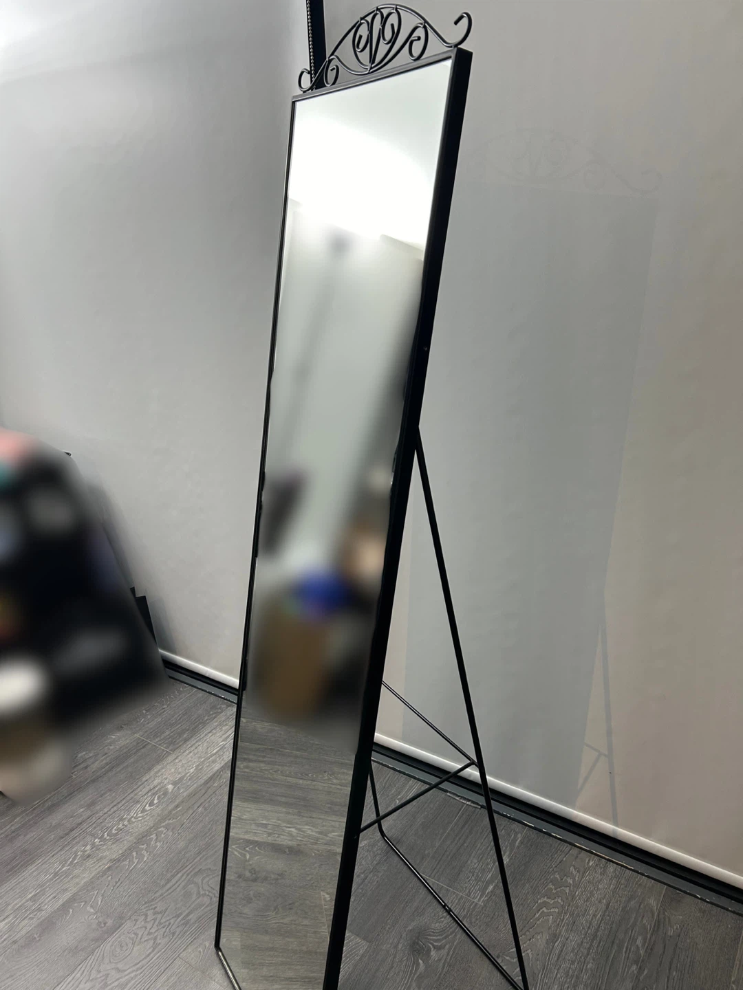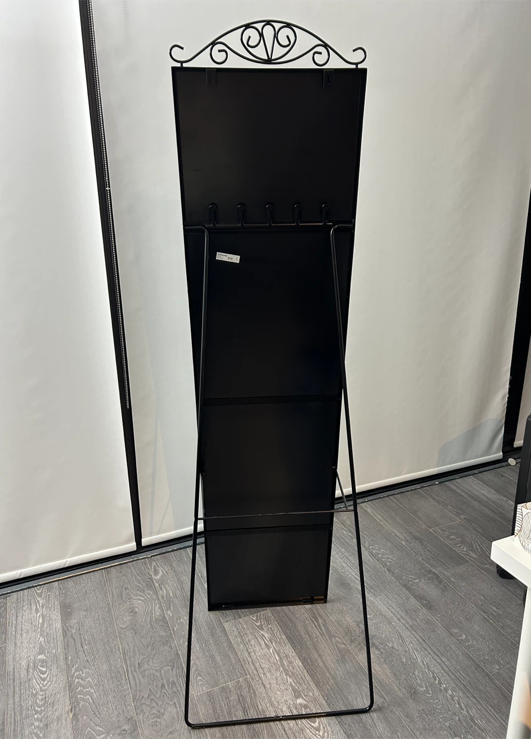 Full-body mirror from IKEA. Crown on top of mirror is removable and it is held up by a stand or hangable on a door/wall. Comes with hooks on the back to hang hats or clothes.